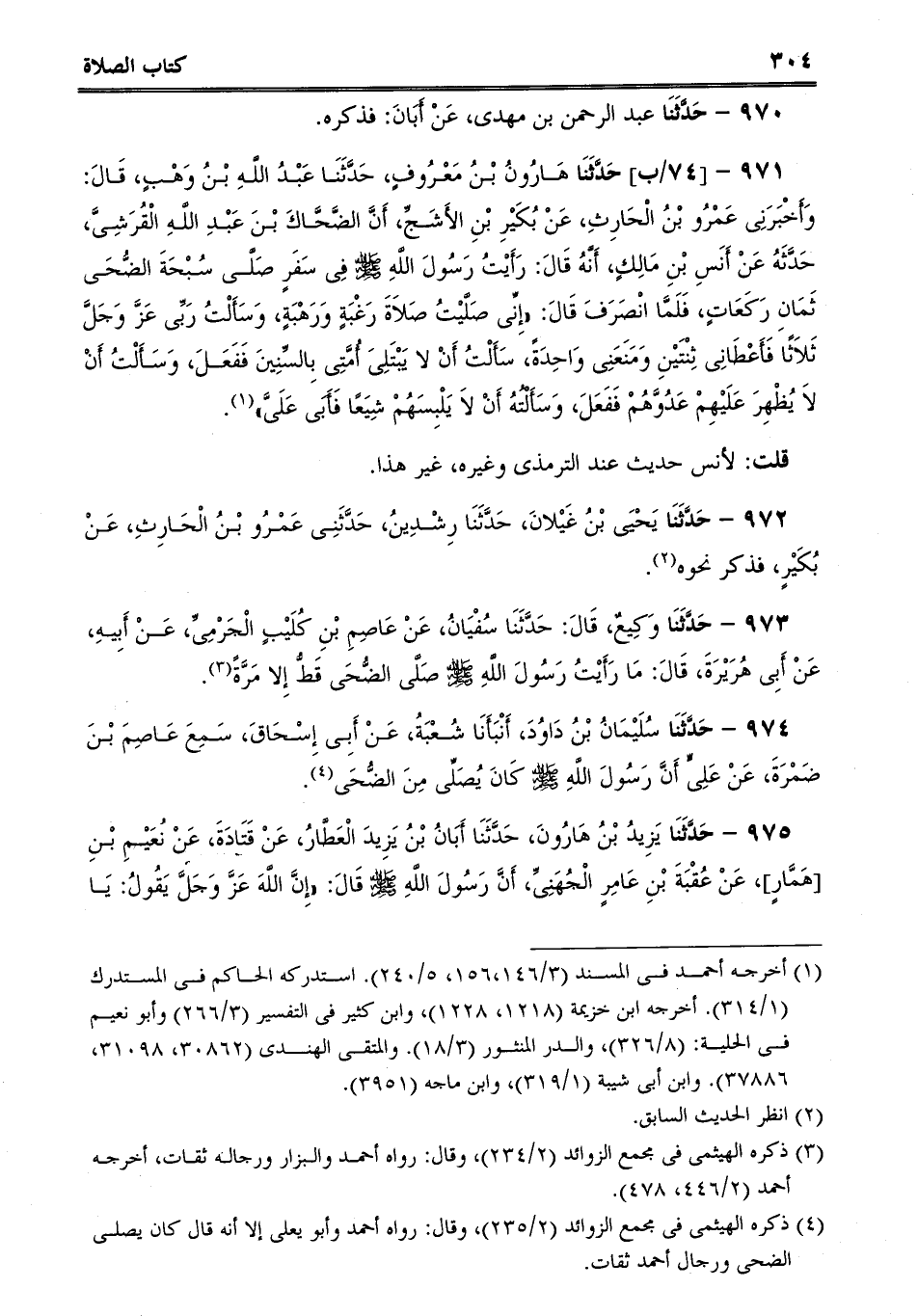 971 - حَدَّثَنَا هَارُونُ بْنُ مَعْرُوفٍ، حَدَّثَنَا عَبْدُ اللَّهِ بْنُ وَهْبٍ، قَالَ: وَأَخْبَرَنِى عَمْرُو بْنُ الْحَارِثِ، عَنْ بُكَيْرِ بْنِ الأَشَجِّ، أَنَّ الضَّحَّاكَ بْنَ عَبْدِ اللَّهِ الْقُرَشِىَّ، حَدَّثَهُ عَنْ أَنَسِ بْنِ مَالِكٍ، أَنَّهُ قَالَ: رَأَيْتُ رَسُولَ اللَّهِ صلى الله عليه وسلم فِى سَفَرٍ صَلَّى سُبْحَةَ الضُّحَى ثَمَانِ رَكَعَاتٍ، فَلَمَّا انْصَرَفَ قَالَ: "إِنِّى صَلَّيْتُ صَلاَةَ رَغْبَةٍ وَرَهْبَةٍ، وَسَأَلْتُ رَبِّى عَزَّ وَجَلَّ ثَلاَثًا فَأَعْطَانِى ثِنْتَيْنِ وَمَنَعَنِى وَاحِدَةً، سَأَلْتُ أَنْ لا يَبْتَلِىَ أُمَّتِى بِالسِّنِينَ فَفَعَلَ، وَسَأَلْتُ أَنْ لاَ يُظْهِرَ عَلَيْهِمْ عَدُوَّهُمْ فَفَعَلَ، وَسَأَلْتُهُ أَنْ لاَ يَلْبِسَهُمْ شِيَعًا فَأَبَى عَلَىَّ.