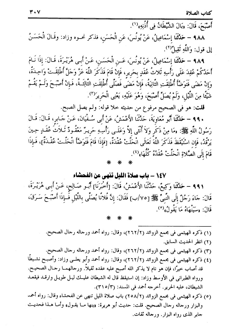 990 - حَدَّثَنَا أَبُو مُعَاوِيَةَ، حَدَّثَنَا الأَعْمَشُ، عَنْ أَبِى سُفْيَانَ، عَنْ جَابِرٍ، قَالَ: قَالَ رَسُولُ اللَّهِ صلى الله عليه وسلم: "مَا مِنْ ذَكَرٍ وَلاَ أُنْثَى إِلاَّ وَعَلَى رَأْسِهِ حَرِيرٌ مَعْقُودٌ ثَلاَثَ عُقَدٍ حِينَ يَرْقُدُ، فَإِنِ اسْتَيْقَظَ فَذَكَرَ اللَّهَ تَعَالَى انْحَلَّتْ عُقْدَةٌ، [فَإِذَا قَامَ فَتَوَضَّأَ انْحَلَّتْ عُقْدَةٌ] ، فَإِذَا قَامَ إِلَى الصَّلاةِ انْحَلَّتْ عُقَدُهُ كُلُّهَا.