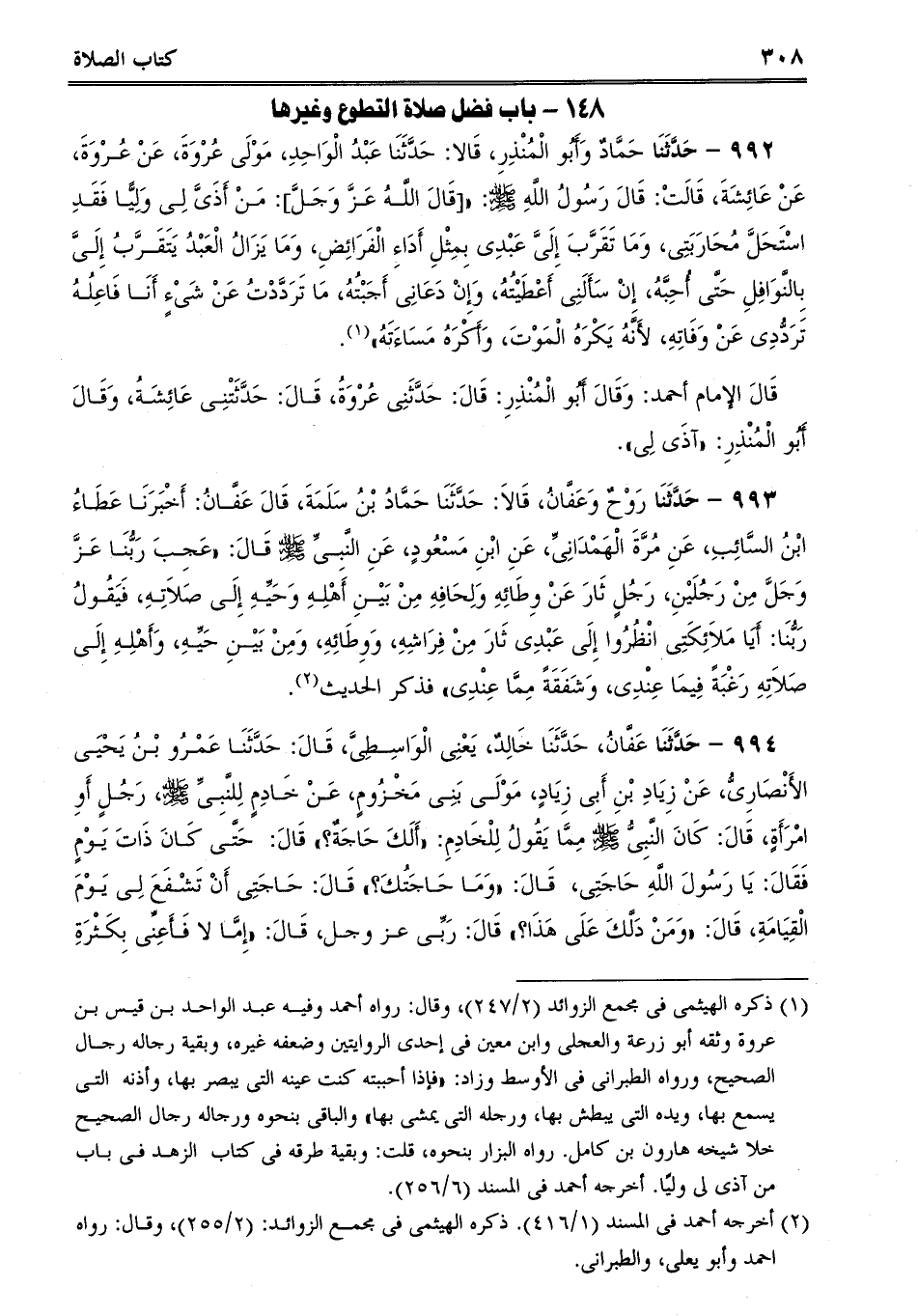 993 - حَدَّثَنَا رَوْحٌ وَعَفَّانُ، قَالاَ: حَدَّثَنَا حَمَّادُ بْنُ سَلَمَةَ، قَالَ عَفَّانُ: أَخْبَرَنَا عَطَاءُ ابْنُ السَّائِبِ، عَنِ مُرَّةَ الْهَمْدَانِىِّ، عَنِ ابْنِ مَسْعُودٍ، عَنِ النَّبِىِّ صلى الله عليه وسلم قَالَ: "عَجِبَ رَبُّنَا عَزَّ وَجَلَّ مِنْ رَجُلَيْنِ، رَجُلٍ ثَارَ عَنْ وِطَائِهِ وَلِحَافِهِ مِنْ بَيْنِ أَهْلِهِ وَحَيِّهِ إِلَى صَلاَتِهِ، فَيَقُولُ رَبُّنَا: أَيَا مَلاَئِكَتِى انْظُرُوا إِلَى عَبْدِى ثَارَ مِنْ فِرَاشِهِ، وَوِطَائِهِ، وَمِنْ بَيْنِ حَيِّهِ، وَأَهْلِهِ إِلَى صَلاَتِهِ رَغْبَةً فِيمَا عِنْدِى، وَشَفَقَةً مِمَّا عِنْدِى فذكر الحديث.