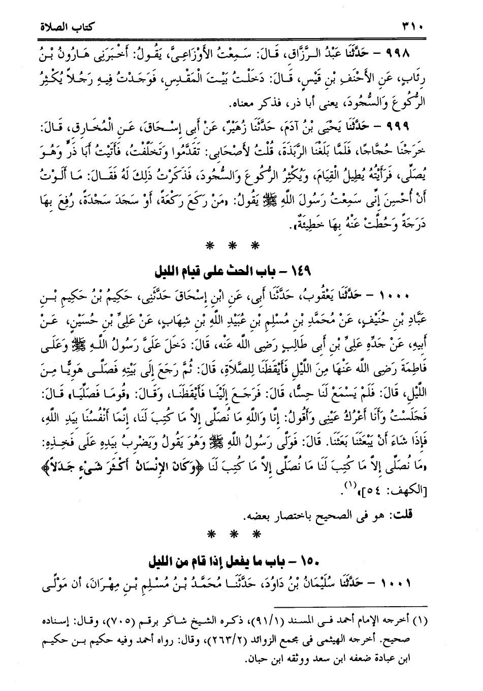 1000 - حَدَّثَنَا يَعْقُوبُ، حَدَّثَنَا أَبِى، عَنِ ابْنِ إِسْحَاقَ حَدَّثَنِى، حَكِيمُ بْنُ حَكِيمِ بْنِ عَبَّادِ بْنِ حُنَيْفٍ، عَنْ مُحَمَّدِ بْنِ مُسْلِمِ بْنِ عُبَيْدِ اللَّهِ بْنِ شِهَابٍ، عَنْ عَلِىِّ بْنِ حُسَيْنٍ، عَنْ أَبِيهِ، عَنْ جَدِّهِ عَلِىِّ بْنِ أَبِى طَالِبٍ رَضِى اللَّه عَنْه، قَالَ: دَخَلَ عَلَىَّ رَسُولُ اللَّهِ صلى الله عليه وسلم وَعَلَى فَاطِمَةَ رَضِى اللَّه عَنْهَا مِنَ اللَّيْلِ فَأَيْقَظَنَا لِلصَّلاَةِ، قَالَ: ثُمَّ رَجَعَ إِلَى بَيْتِهِ فَصَلَّى هَوِيًّا مِنَ اللَّيْلِ، قَالَ: فَلَمْ يَسْمَعْ لَنَا حِسًّا، قَالَ: فَرَجَعَ إِلَيْنَا فَأَيْقَظَنَا، وَقَالَ: "قُومَا فَصَلِّيَا قَالَ: فَجَلَسْتُ وَأَنَا أَعْرُكُ عَيْنِى وَأَقُولُ: إِنَّا وَاللَّهِ مَا نُصَلِّى إِلاَّ مَا كُتِبَ لَنَا، إِنَّمَا أَنْفُسُنَا بِيَدِ اللَّهِ، فَإِذَا شَاءَ أَنْ يَبْعَثَنَا بَعَثَنَا. قَالَ: فَوَلَّى رَسُولُ اللَّهِ صلى الله عليه وسلم وَهُوَ يَقُولُ وَيَضْرِبُ بِيَدِهِ عَلَى فَخِذِهِ: "مَا نُصَلِّى إِلاَّ مَا كُتِبَ لَنَا مَا نُصَلِّى إِلاَّ مَا كُتِبَ لَنَا {وَكَانَ الإِنْسَانُ أَكْثَرَ شَىْءٍ جَدَلاً} .