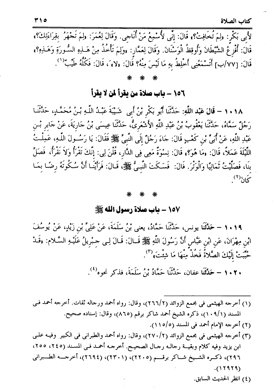 1018 - قَالَ عَبْد اللَّهِ: حَدَّثَنَا أَبُو بَكْرِ بْنُ أَبِى شَيْبَةَ عَبْدُ اللَّهِ بْنُ مُحَمَّدٍ، حَدَّثَنَا رَجُلٌ سَمَّاهُ، حَدَّثَنَا يَعْقُوبُ بْنُ عَبْدِ اللَّهِ الأَشْعَرِىُّ، حَدَّثَنَا عِيسَى بْنُ جَارِيَةَ، عَنْ جَابِرِ بْنِ عَبْدِ اللَّهِ، عَنْ أُبَىِّ بْنِ كَعْبٍ قَالَ: جَاءَ رَجُلٌ إِلَى النَّبِىِّ صلى الله عليه وسلم فَقَالَ: يَا رَسُولَ اللَّهِ، عَمِلْتُ اللَّيْلَةَ عَمَلاً، قَالَ: "مَا هُوَ؟ قَالَ: نِسْوَةٌ مَعِى فِى الدَّارِ، قُلْنَ لِى: إِنَّكَ تَقْرَأُ وَلاَ نَقْرَأُ، فَصَلِّ بِنَا، فَصَلَّيْتُ ثَمَانِيًا وَالْوَتْرَ. قَالَ: فَسَكَتَ النَّبِىُّ صلى الله عليه وسلم، قَالَ: فَرَأَيْنَا أَنَّ سُكُوتَهُ رِضًا بِمَا كَانَ.