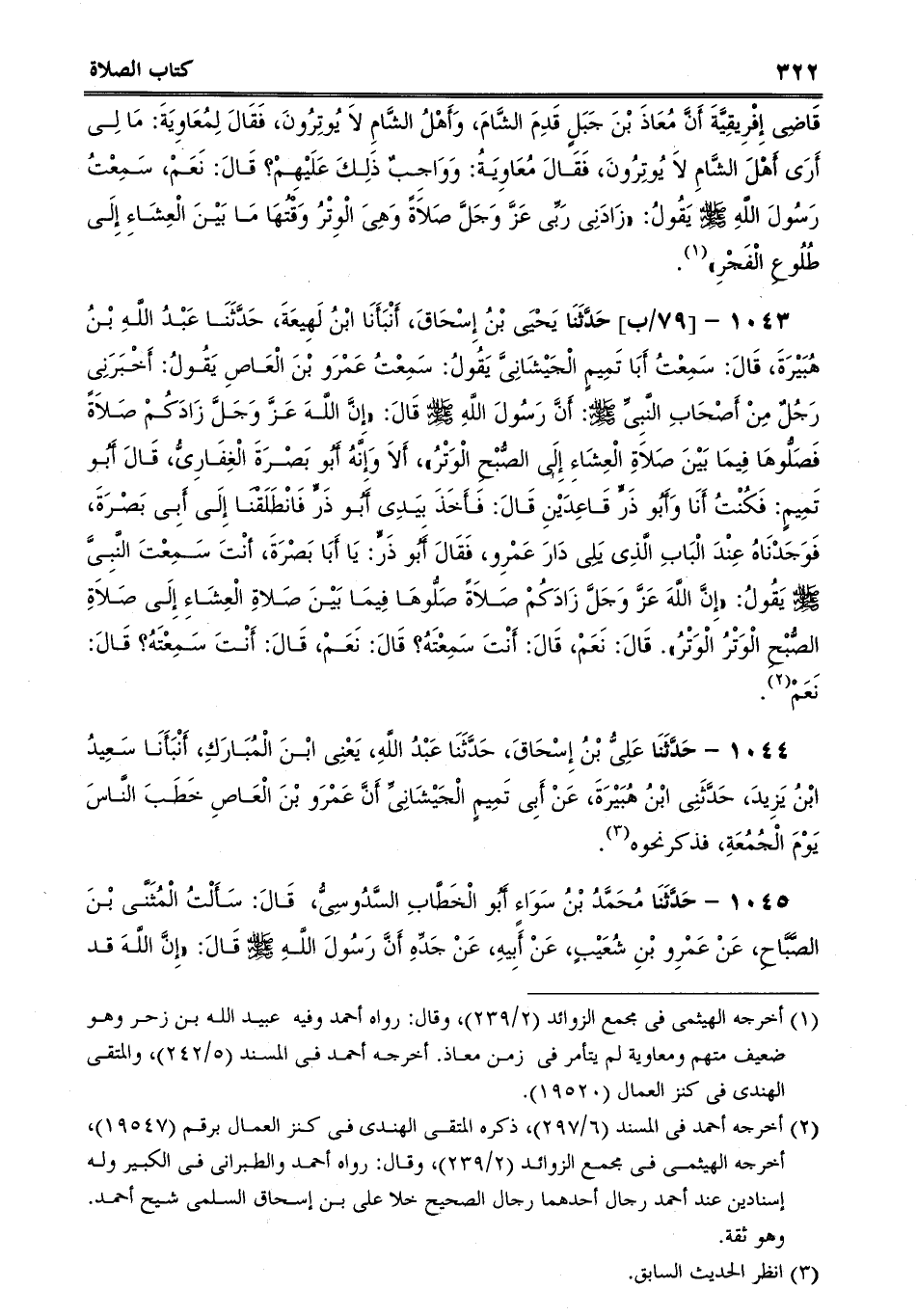 1043 - حَدَّثَنَا يَحْيَى بْنُ إِسْحَاقَ، أَنْبَأَنَا ابْنُ لَهِيعَةَ، حَدَّثَنَا عَبْدُ اللَّهِ بْنُ هُبَيْرَةَ، قَالَ: سَمِعْتُ أَبَا تَمِيمٍ الْجَيْشَانِىَّ يَقُولُ: سَمِعْتُ عَمْرَو بْنَ الْعَاصِ يَقُولُ: أَخْبَرَنِى رَجُلٌ مِنْ أَصْحَابِ النَّبِىِّ صلى الله عليه وسلم: أَنَّ رَسُولَ اللَّهِ صلى الله عليه وسلم قَالَ: "إِنَّ اللَّهَ عَزَّ وَجَلَّ زَادَكُمْ صَلاَةً فَصَلُّوهَا فِيمَا بَيْنَ صَلاَةِ الْعِشَاءِ إِلَى الصُّبْحِ الْوَتْرُ، أَلاَ وَإِنَّهُ أَبُو بَصْرَةَ الْغِفَارِىُّ، قَالَ أَبُو تَمِيمٍ: فَكُنْتُ أَنَا وَأَبُو ذَرٍّ قَاعِدَيْنِ قَالَ: فَأَخَذَ بِيَدِى أَبُو ذَرٍّ فَانْطَلَقْنَا إِلَى أَبِى بَصْرَةَ، فَوَجَدْنَاهُ عِنْدَ الْبَابِ الَّذِى يَلِى دَارَ عَمْرِو، فَقَالَ أَبُو ذَرٍّ: يَا أَبَا بَصْرَةَ، أنْتَ سَمِعْتَ النَّبِىَّ صلى الله عليه وسلم يَقُولُ: "إِنَّ اللَّهَ عَزَّ وَجَلَّ زَادَكُمْ صَلاَةً صَلُّوهَا فِيمَا بَيْنَ صَلاةِ الْعِشَاءِ إِلَى صَلاَةِ الصُّبْحِ الْوَتْرُ الْوَتْرُ. قَالَ: نَعَمْ، قَالَ: أَنْتَ سَمِعْتَهُ؟ قَالَ: نَعَمْ، قَالَ: أَنْتَ سَمِعْتَهُ؟ قَالَ: نَعَمْ.
