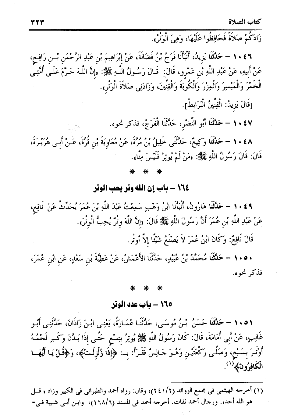 1049 - حَدَّثَنَا هَارُونُ، أَنْبَأَنَا ابْنُ وَهْبٍ سَمِعْتُ عَبْدَ اللَّهِ بْنَ عُمَرَ يُحَدِّثُ عَنْ نَافِعٍ، عَنْ عَبْدِ اللَّهِ بْنِ عُمَرَ أَنَّ رَسُولَ اللَّهِ صلى الله عليه وسلم قَالَ: "إِنَّ اللَّهَ وِتْرٌ يُحِبُّ الْوِتْرَ.