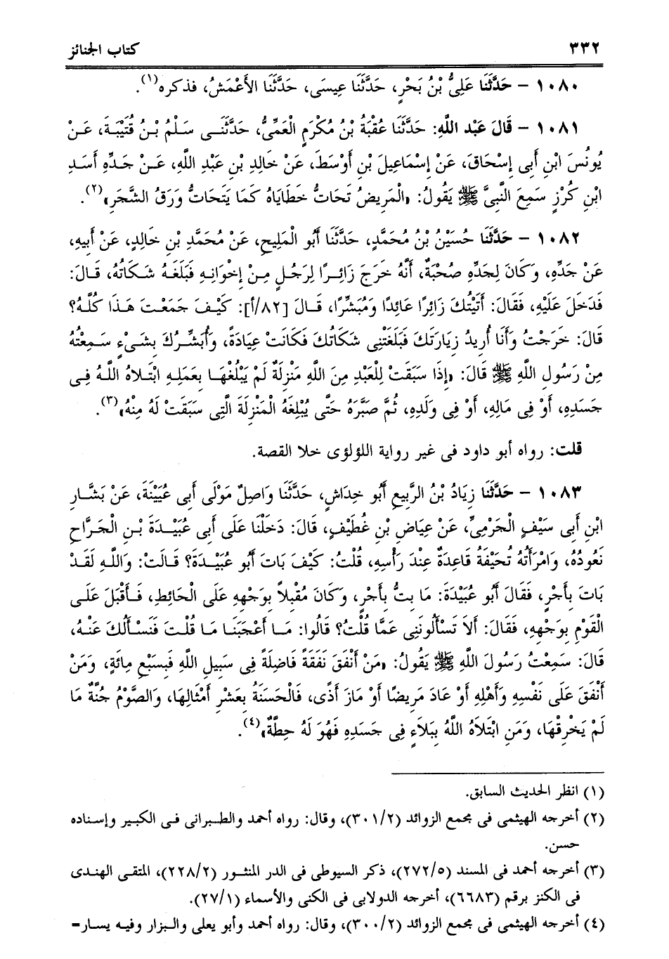 1083 - حَدَّثَنَا زِيَادُ بْنُ الرَّبِيعِ أَبُو خِدَاشٍ، حَدَّثَنَا وَاصِلٌ مَوْلَى أَبِى عُيَيْنَةَ، عَنْ بَشَّارِ ابْنِ أَبِى سَيْفٍ الْجَرْمِىِّ، عَنْ عِيَاضِ بْنِ غُطَيْفٍ، قَالَ: دَخَلْنَا عَلَى أَبِى عُبَيْدَةَ بْنِ الْجَرَّاحِ نَعُودُهُ، وَامْرَأَتُهُ تُحَيْفَةُ قَاعِدَةٌ عِنْدَ رَأْسِهِ، قُلْتُ: كَيْفَ بَاتَ أَبُو عُبَيْدَةَ؟ قَالَتْ: وَاللَّهِ لَقَدْ بَاتَ بِأَجْرٍ، فَقَالَ أَبُو عُبَيْدَةَ: مَا بِتُّ بِأَجْرٍ، وَكَانَ مُقْبِلاً بِوَجْهِهِ عَلَى الْحَائِطِ، فَأَقْبَلَ عَلَى الْقَوْمِ بِوَجْهِهِ، فَقَالَ: أَلاَ تَسْأَلُونَنِى عَمَّا قُلْتُ؟ قَالُوا: مَا أَعْجَبَنَا مَا قُلْتَ فَنَسْأَلُكَ عَنْهُ، قَالَ: سَمِعْتُ رَسُولَ اللَّهِ صلى الله عليه وسلم يَقُولُ: "مَنْ أَنْفَقَ نَفَقَةً فَاضِلَةً فِى سَبِيلِ اللَّهِ فَبِسَبْعِ مِائَةٍ، وَمَنْ أَنْفَقَ عَلَى نَفْسِهِ وَأَهْلِهِ أَوْ عَادَ مَرِيضًا أَوْ مَازَ أَذًى، فَالْحَسَنَةُ بِعَشْرِ أَمْثَالِهَا، وَالصَّوْمُ جُنَّةٌ مَا لَمْ يَخْرِقْهَا، وَمَنِ ابْتَلاَهُ اللَّهُ بِبَلاَءٍ فِى جَسَدِهِ فَهُوَ لَهُ حِطَّةٌ.