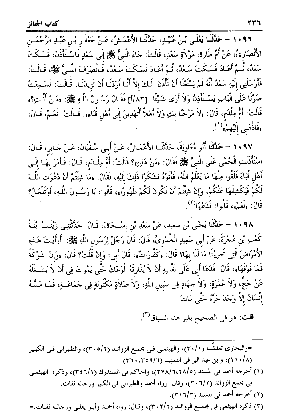 1096 - حَدَّثَنَا يَعْلَى بْنُ عُبَيْدٍ، حَدَّثَنَا الأَعْمَشُ، عَنْ جَعْفَرِ بْنِ عَبْدِ الرَّحْمَنِ الأَنْصَارِىِّ، عَنْ أُمِّ طَارِقٍ مَوْلاَةِ سَعْدٍ، قَالَتْ: جَاءَ النَّبِىُّ صلى الله عليه وسلم إِلَى سَعْدٍ فَاسْتَأْذَنَ، فَسَكَتَ سَعْدٌ، ثُمَّ أَعَادَ فَسَكَتَ سَعْدٌ، ثُمَّ أَعَادَ فَسَكَتَ سَعْدٌ، فَانْصَرَفَ النَّبِىُّ صلى الله عليه وسلم، قَالَتْ: فَأَرْسَلَنِى إِلَيْهِ سَعْدٌ أَنَّهُ لَمْ يَمْنَعْنَا أَنْ نَأْذَنَ لَكَ إِلاَّ أَنَّا أَرَدْنَا أَنْ تَزِيدَنَا. قَالَتْ: فَسَمِعْتُ صَوْتًا عَلَى الْبَابِ يَسْتَأْذِنُ وَلاَ أَرَى شَيْئًا. فَقَالَ رَسُولُ اللَّهِ صلى الله عليه وسلم: "مَنْ أَنْتِ؟ قَالَتْ: أُمُّ مِلْدَمٍ، قَالَ: "لاَ مَرْحَبًا بِكِ وَلاَ أَهْلاً أَتُهْدِينَ إِلَى أَهْلِ قُبَاء. قَالَتْ: نَعَمْ، قَالَ: "فَاذْهَبِى إِلَيْهِمْ.