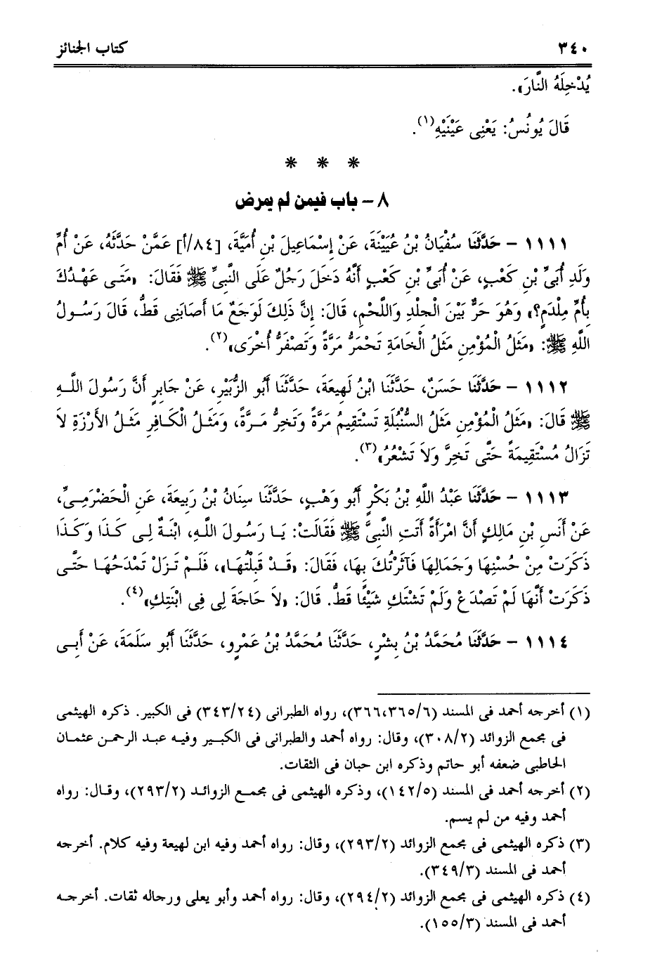 1111 - حَدَّثَنَا سُفْيَانُ بْنُ عُيَيْنَةَ، عَنْ إِسْمَاعِيلَ بْنِ أُمَيَّةَ، عَمَّنْ حَدَّثَهُ، عَنْ أُمِّ وَلَدِ أُبَىِّ بْنِ كَعْبٍ، عَنْ أُبَىِّ بْنِ كَعْبٍ أَنَّهُ دَخَلَ رَجُلٌ عَلَى النَّبِىِّ صلى الله عليه وسلم فَقَالَ: "مَتَى عَهْدُكَ بِأُمِّ مِلْدَمٍ؟ وَهُوَ حَرٌّ بَيْنَ الْجِلْدِ وَاللَّحْمِ، قَالَ: إِنَّ ذَلِكَ لَوَجَعٌ مَا أَصَابَنِى قَطُّ، قَالَ رَسُولُ اللَّهِ صلى الله عليه وسلم: "مَثَلُ الْمُؤْمِنِ مَثَلُ الْخَامَةِ تَحْمَرُّ مَرَّةً وَتَصْفَرُّ أُخْرَى.