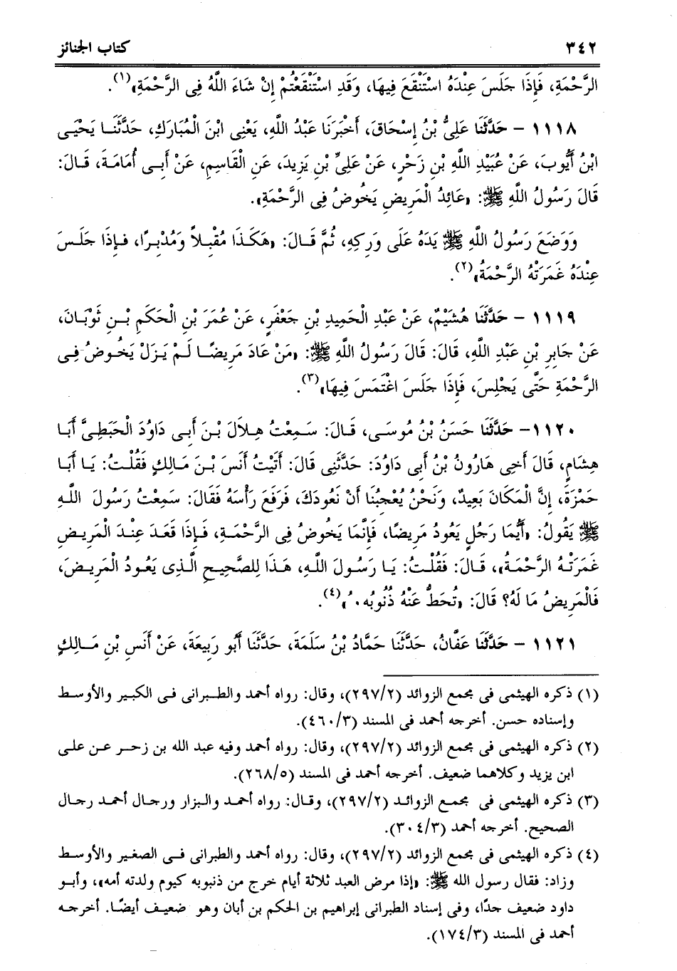 1118 - حَدَّثَنَا عَلِىُّ بْنُ إِسْحَاقَ، أَخْبَرَنَا عَبْدُ اللَّهِ، يَعْنِى ابْنَ الْمُبَارَكِ، حَدَّثَنَا يَحْيَى ابْنُ أَيُّوبَ، عَنْ عُبَيْدِ اللَّهِ بْنِ زَحْرٍ، عَنْ عَلِىِّ بْنِ يَزِيدَ، عَنِ الْقَاسِمِ، عَنْ أَبِى أُمَامَةَ، قَالَ: قَالَ رَسُولُ اللَّهِ صلى الله عليه وسلم: "عَائِدُ الْمَرِيضِ يَخُوضُ فِى الرَّحْمَةِ.