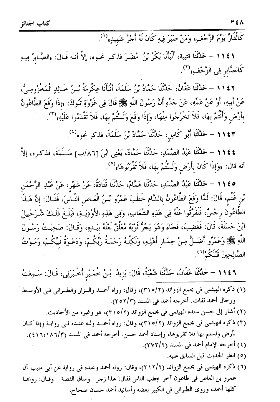 1142 - حَدَّثَنَا عَفَّانُ، حَدَّثَنَا حَمَّادُ بْنُ سَلَمَةَ، أَنْبَأَنَا عِكْرِمَةُ بْنُ خَالِدٍ الْمَخْزُومِىُّ، عَنْ أَبِيهِ، أَوْ عَنْ عَمِّهِ، عَنْ جَدِّهِ أَنَّ رَسُولَ اللَّهِ صلى الله عليه وسلم قَالَ فِى غَزْوَةِ تَبُوكَ: "إِذَا وَقَعَ الطَّاعُونُ بِأَرْضٍ وَأَنْتُمْ بِهَا، فَلاَ تَخْرُجُوا مِنْهَا، وَإِذَا وَقَعَ وَلَسْتُمْ بِهَا، فَلاَ تَقْدَمُوا عَلَيْهِ.