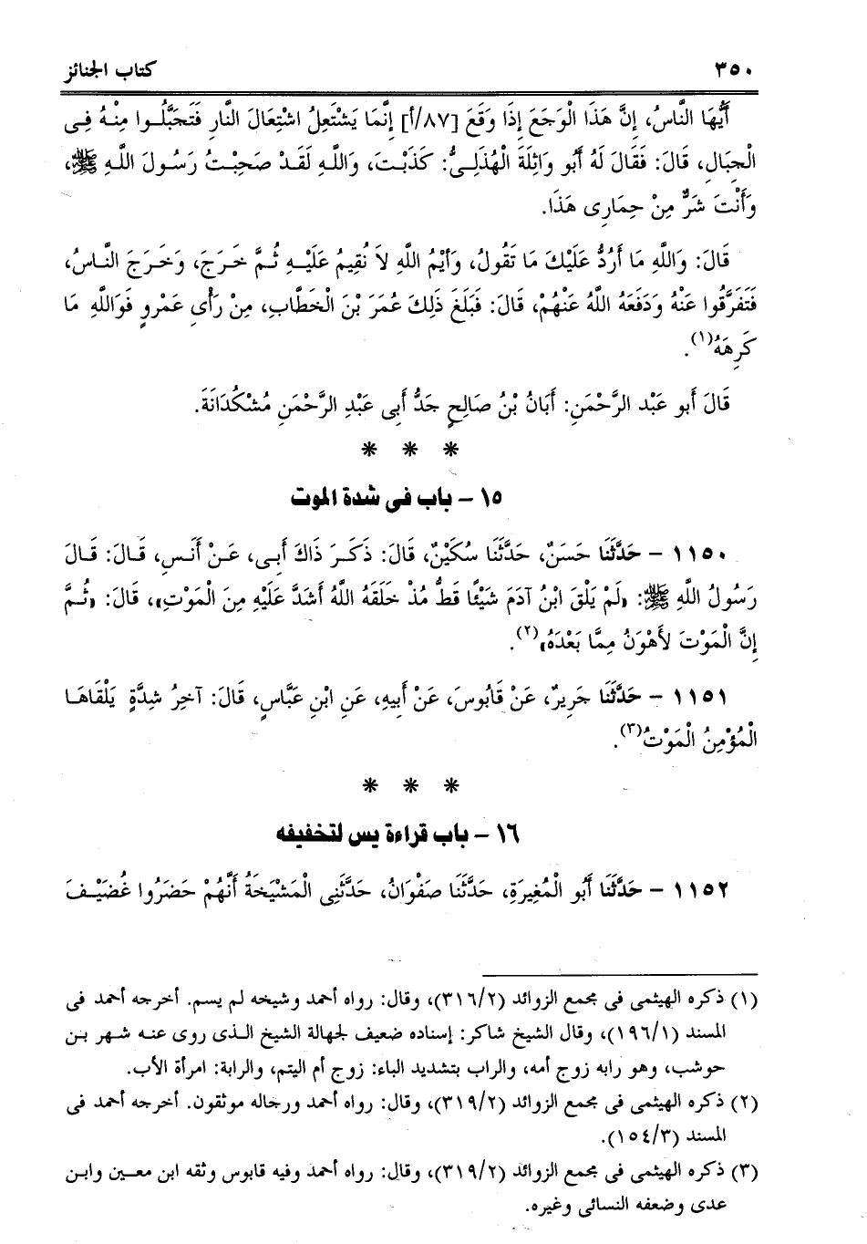 1152 - حَدَّثَنَا أَبُو الْمُغِيرَةِ، حَدَّثَنَا صَفْوَانُ، حَدَّثَنِى الْمَشْيَخَةُ أَنَّهُمْ حَضَرُوا غُضَيْف -[351]- َ ابْنَ الْحَارِثِ الثُّمَالِىَّ حِينَ اشْتَدَّ سَوْقُهُ، فَقَالَ: هَلْ مِنْكُمْ أَحَدٌ يَقْرَأُ يس؟ قَالَ: فَقَرَأَهَا صَالِحُ بْنُ شُرَيْحٍ السَّكُونِىُّ، فَلَمَّا بَلَغَ أَرْبَعِينَ مِنْهَا قُبِضَ. قَالَ: فَكَانَ الْمَشْيَخَةُ يَقُولُونَ: إِذَا قُرِئَتْ عِنْدَ الْمَيِّتِ خُفِّفَ عَنْهُ بِهَا.