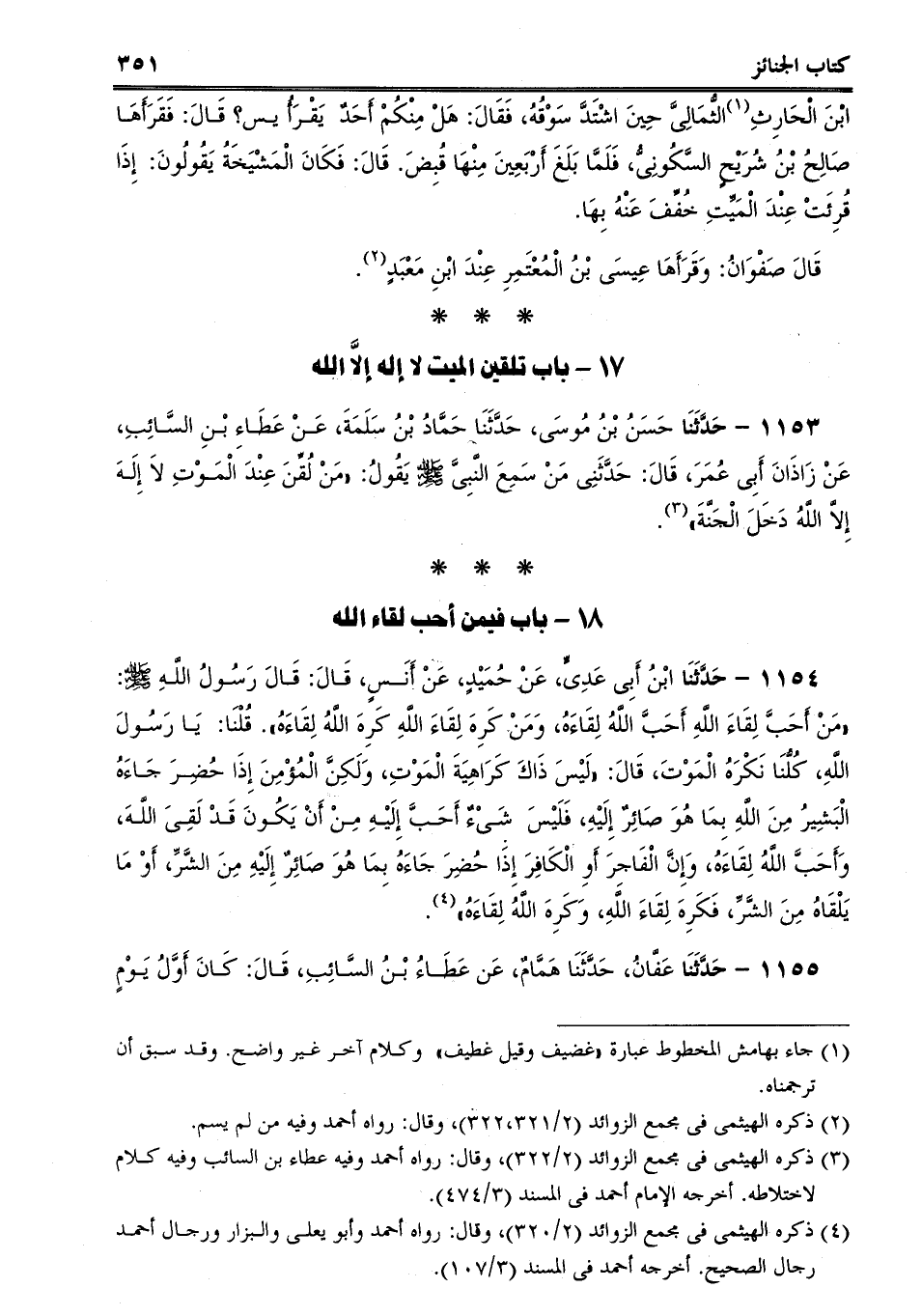 1155 - حَدَّثَنَا عَفَّانُ، حَدَّثَنَا هَمَّامٌ، عَن عَطَاءُ بْنُ السَّائِبِ، قَالَ: كَانَ أَوَّلُ يَوْمٍ -[352]- عَرَفْتُ فِيهِ عَبْدَ الرَّحْمَنِ بْنَ أَبِى لَيْلَى رَأَيْتُ شَيْخًا أَبْيَضَ الرَّأْسِ وَاللِّحْيَةِ عَلَى حِمَارٍ، وَهُوَ يَتْبَعُ جِنَازَةً، فَسَمِعْتُهُ يَقُولُ: حَدَّثَنِى فُلاَنُ بْنُ فُلاَنٍ سَمِعَ رَسُولَ اللَّهِ صلى الله عليه وسلم يَقُولُ: "مَنْ أَحَبَّ لِقَاءَ اللَّهِ أَحَبَّ اللَّهُ لِقَاءَهُ، وَمَنْ كَرِهَ لِقَاءَ اللَّهِ كَرِهَ اللَّهُ لِقَاءَهُ، قَالَ: فَأَكَبَّ الْقَوْمُ يَبْكُونَ، فَقَالَ: "مَا يُبْكِيكُمْ؟ فَقَالُوا: إِنَّا نَكْرَهُ الْمَوْتَ، قَالَ: "لَيْسَ ذَلِكَ، وَلَكِنَّهُ إِذَا حَضَرَ {فَأَمَّا إِنْ كَانَ مِنَ الْمُقَرَّبِينَ فَرَوْحٌ وَرَيْحَانٌ وَجَنَّةُ نَعِيمٍ} ، فَإِذَا بُشِّرَ بِذَلِكَ أَحَبَّ لِقَاءَ اللَّهِ، وَاللَّهُ لِلِقَائِهِ أَحَبُّ {وَأَمَّا إِنْ كَانَ مِنَ الْمُكَذِّبِينَ الضَّالِّينَ فَنُزُلٌ مِنْ حَمِيمٍ} - قَالَ عَطَاءٌ: وَفِى قِرَاءَةِ ابْنِ مَسْعُودٍ "ثُمَّ تَصْلِيَةُ جَحِيمٍ - فَإِذَا بُشِّرَ بِذَلِكَ يَكْرَهُ لِقَاءَ اللَّهِ وَاللَّهُ لِلِقَائِهِ أَكْرَهُ.
