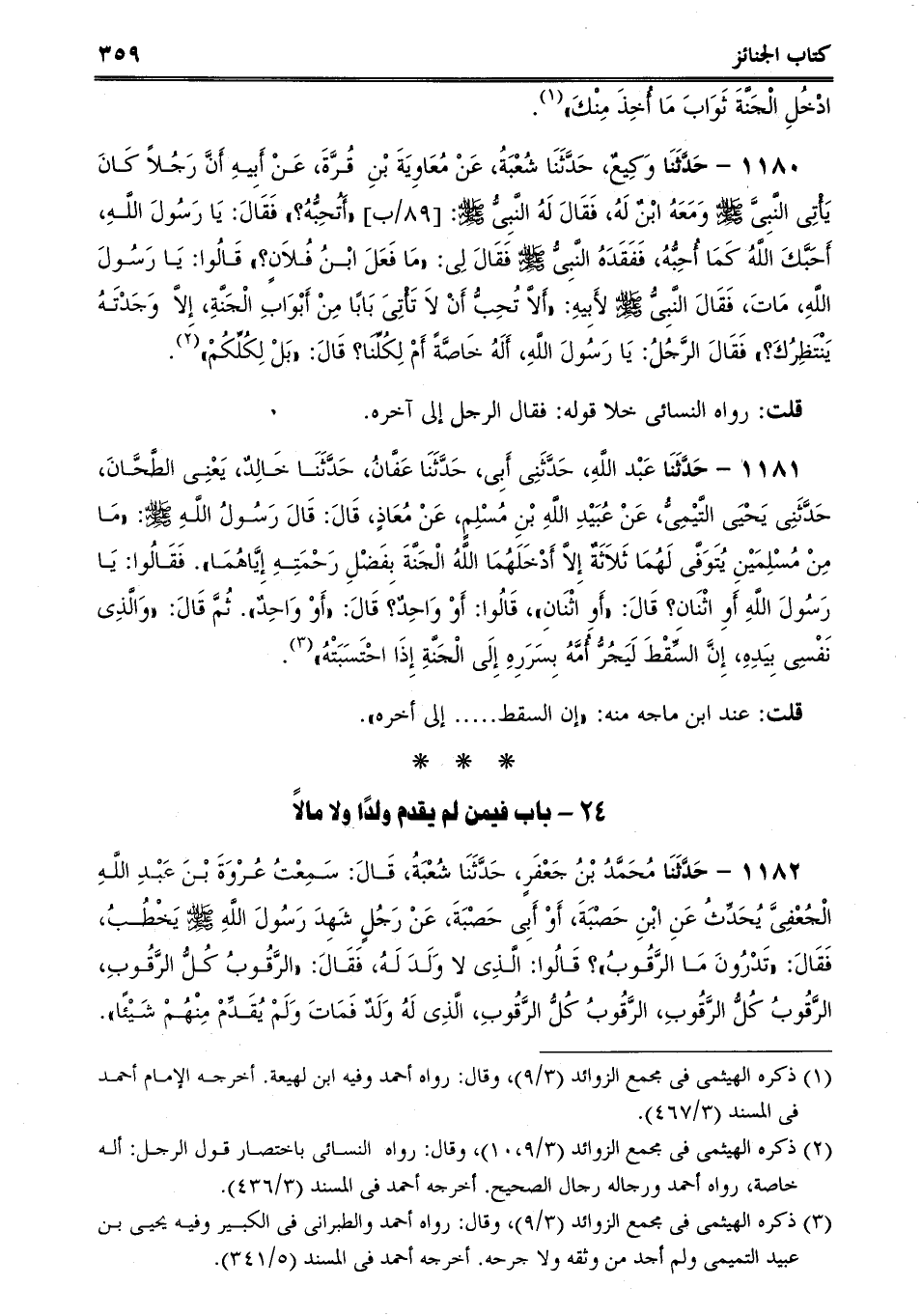 1181 - حَدَّثَنَا عَبْد اللَّهِ، حَدَّثَنِى أَبِى، حَدَّثَنَا عَفَّانُ، حَدَّثَنَا خَالِدٌ، يَعْنِى الطَّحَّانَ، حَدَّثَنِى يَحْيَى التَّيْمِىُّ، عَنْ عُبَيْدِ اللَّهِ بْنِ مُسْلِمٍ، عَنْ مُعَاذٍ، قَالَ: قَالَ رَسُولُ اللَّهِ صلى الله عليه وسلم: "مَا مِنْ مُسْلِمَيْنِ يُتَوَفَّى لَهُمَا ثَلاَثَةٌ إِلاَّ أَدْخَلَهُمَا اللَّهُ الْجَنَّةَ بِفَضْلِ رَحْمَتِهِ إِيَّاهُمَا. فَقَالُوا: يَا رَسُولَ اللَّهِ أَوِ اثْنَانِ؟ قَالَ: "أَوِ اثْنَانِ، قَالُوا: أَوْ وَاحِدٌ؟ قَالَ: "أَوْ وَاحِدٌ. ثُمَّ قَالَ: "وَالَّذِى نَفْسِى بِيَدِهِ، إِنَّ السِّقْطَ لَيَجُرُّ أُمَّهُ بِسَرَرِهِ إِلَى الْجَنَّةِ إِذَا احْتَسَبَتْهُ.