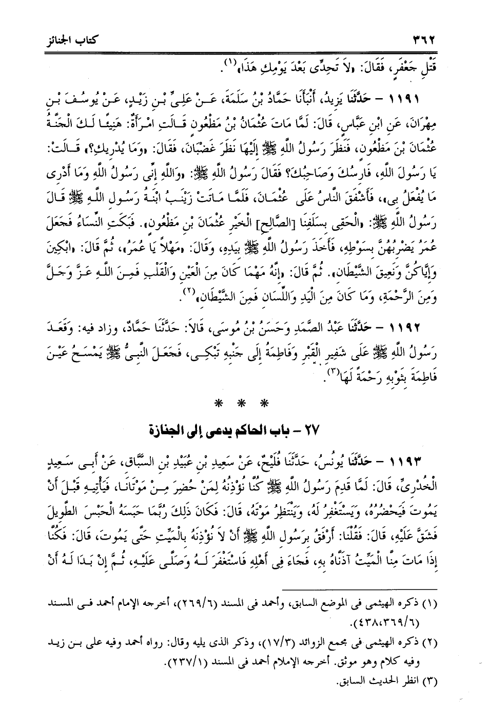 1191 - حَدَّثَنَا يَزِيدُ، أَنْبَأَنَا حَمَّادُ بْنُ سَلَمَةَ، عَنْ عَلِىِّ بْنِ زَيْدٍ، عَنْ يُوسُفَ بْنِ مِهْرَانَ، عَنِ ابْنِ عَبَّاسٍ، قَالَ: لَمَّا مَاتَ عُثْمَانُ بْنُ مَظْعُونٍ قَالَتِ امْرَأَةٌ: هَنِيئًا لَكَ الْجَنَّةُ عُثْمَانَ بْنَ مَظْعُونٍ، فَنَظَرَ رَسُولُ اللَّهِ صلى الله عليه وسلم إِلَيْهَا نَظَرَ غَضْبَانَ، فَقَالَ: "وَمَا يُدْرِيكِ؟ قَالَتْ: يَا رَسُولَ اللَّهِ، فَارِسُكَ وَصَاحِبُكَ؟ فَقَالَ رَسُولُ اللَّهِ صلى الله عليه وسلم: "وَاللَّهِ إِنِّى رَسُولُ اللَّهِ وَمَا أَدْرِى مَا يُفْعَلُ بِى، فَأَشْفَقَ النَّاسُ عَلَى عُثْمَانَ، فَلَمَّا مَاتَتْ زَيْنَبُ ابْنَةُ رَسُولِ اللَّهِ صلى الله عليه وسلم قَالَ رَسُولُ اللَّهِ صلى الله عليه وسلم: "الْحَقِى بِسَلَفِنَا [الصَّالِحِ] الْخَيْرِ عُثْمَانَ بْنِ مَظْعُونٍ. فَبَكَتِ النِّسَاءُ فَجَعَلَ عُمَرُ يَضْرِبُهُنَّ بِسَوْطِهِ، فَأَخَذَ رَسُولُ اللَّهِ صلى الله عليه وسلم بِيَدِهِ، وَقَالَ: "مَهْلاً يَا عُمَرُ، ثُمَّ قَالَ: "ابْكِينَ وَإِيَّاكُنَّ وَنَعِيقَ الشَّيْطَانِ. ثُمَّ قَالَ: "إِنَّهُ مَهْمَا كَانَ مِنَ الْعَيْنِ وَالْقَلْبِ فَمِنَ اللَّهِ عَزَّ وَجَلَّ وَمِنَ الرَّحْمَةِ، وَمَا كَانَ مِنَ الْيَدِ وَاللِّسَانِ فَمِنَ الشَّيْطَانِ.