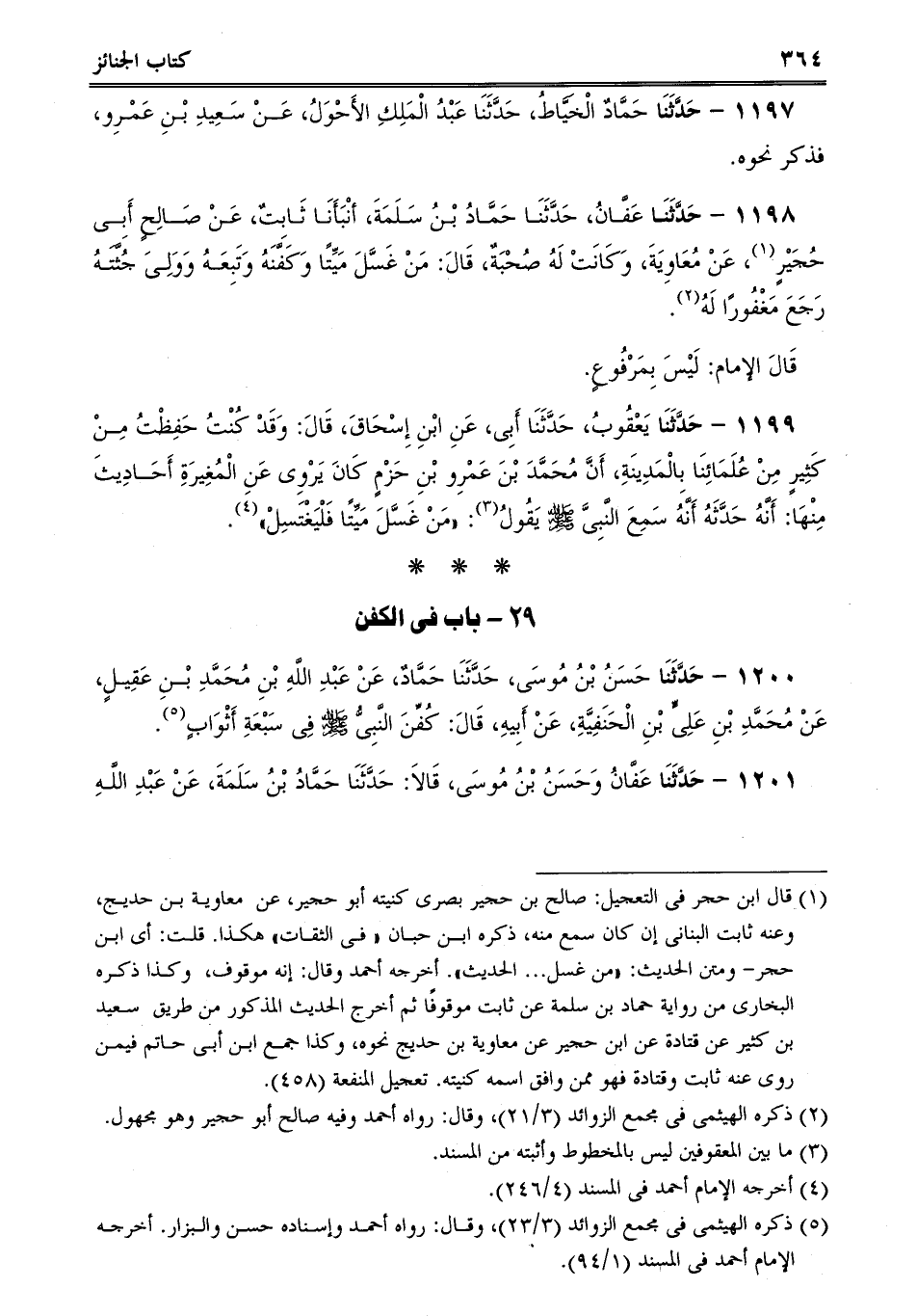 1198 - حَدَّثَنَا عَفَّانُ، حَدَّثَنَا حَمَّادُ بْنُ سَلَمَةَ، أنْبَأَنَا ثَابِتٌ، عَنْ صَالِحٍ أَبِى حُجَيْرٍ، عَنْ مُعَاوِيَةَ، وَكَانَتْ لَهُ صُحْبَةٌ، قَالَ: مَنْ غَسَّلَ مَيِّتًا وَكَفَّنَهُ وَتَبِعَهُ وَوَلِىَ جُثَّتَهُ رَجَعَ مَغْفُورًا لَهُ.