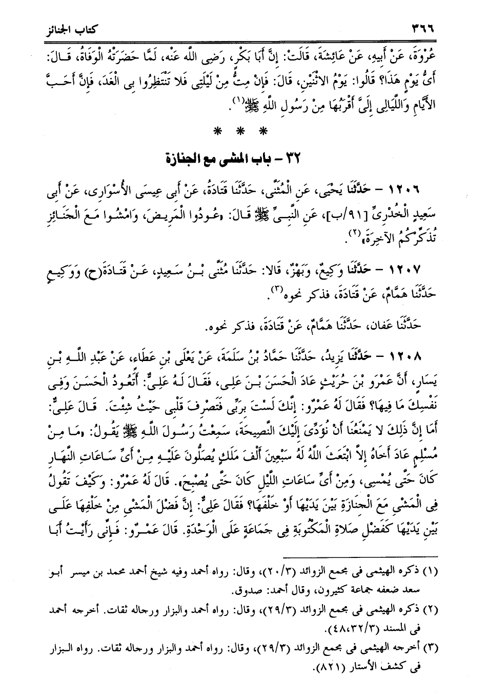 1208 - حَدَّثَنَا يَزِيدُ، حَدَّثَنَا حَمَّادُ بْنُ سَلَمَةَ، عَنْ يَعْلَى بْنِ عَطَاءٍ، عَنْ عَبْدِ اللَّهِ بْنِ يَسَارٍ، أَنَّ عَمْرَو بْنَ حُرَيْثٍ عَادَ الْحَسَنَ بْنَ عَلِى، فَقَالَ لَهُ عَلِىٌّ: أَتَعُودُ الْحَسَنَ وَفِى نَفْسِكَ مَا فِيهَا؟ فَقَالَ لَهُ عَمْرٌو: إِنَّكَ لَسْتَ بِرَبِّى فَتَصْرِفَ قَلْبِى حَيْثُ شِئْتَ. قَالَ عَلِىٌّ: أَمَا إِنَّ ذَلِكَ لا يَمْنَعُنَا أَنْ نُؤَدِّىَ إِلَيْكَ النَّصِيحَةَ، سَمِعْتُ رَسُولَ اللَّهِ صلى الله عليه وسلم يَقُولُ: "مَا مِنْ مُسْلِمٍ عَادَ أَخَاهُ إِلاَّ ابْتَعَثَ اللَّهُ لَهُ سَبْعِينَ أَلْفَ مَلَكٍ يُصَلُّونَ عَلَيْهِ مِنْ أَىِّ سَاعَاتِ النَّهَارِ كَانَ حَتَّى يُمْسِى، وَمِنْ أَىِّ سَاعَاتِ اللَّيْلِ كَانَ حَتَّى يُصْبِحَ. قَالَ لَهُ عَمْرٌو: وَكَيْفَ تَقُولُ فِى الْمَشْىِ مَعَ الْجِنَازَةِ بَيْنَ يَدَيْهَا أَوْ خَلْفَهَا؟ فَقَالَ عَلِىٌّ: إِنَّ فَضْلَ الْمَشْىِ مِنْ خَلْفِهَا عَلَى بَيْنِ يَدَيْهَا كَفَضْلِ صَلاةِ الْمَكْتُوبَةِ فِى جَمَاعَةٍ عَلَى الْوَحْدَةِ. قَالَ عَمْرٌو: فَإِنِّى رَأَيْتُ أَبَا -[367]- بَكْرٍ وَعُمَرَ يَمْشِيَانِ أَمَامَ الْجِنَازَةِ، قَالَ عَلِىٌّ: إِنَّهُمَا إِنَّمَا كَرِهَا أَنْ يُحْرِجَا النَّاسَ.