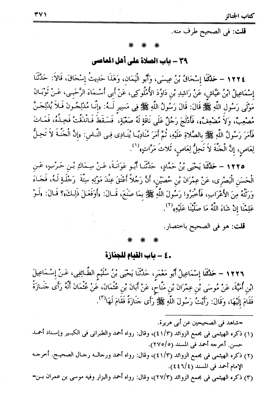1226 - حَدَّثَنَا إِسْمَاعِيلُ أَبُو مَعْمَرٍ، حَدَّثَنَا يَحْيَى بْنُ سُلَيْمٍ الطَّائِفِى، عَنْ إِسْمَاعِيلَ ابْنِ أُمَيَّةَ، عَنْ مُوسَى بْنِ عِمْرَانَ بْنِ مَنَّاحٍ، عَنْ أَبَانَ بْنِ عُثْمَانَ، عَنْ عُثْمَانَ أَنَّهُ رَأَى جَنَازَةً فَقَامَ إِلَيْهَا، وَقَالَ: رَأَيْتُ رَسُولَ اللَّهِ صلى الله عليه وسلم رَأَى جَنَازَةً فَقَامَ لَهَا.