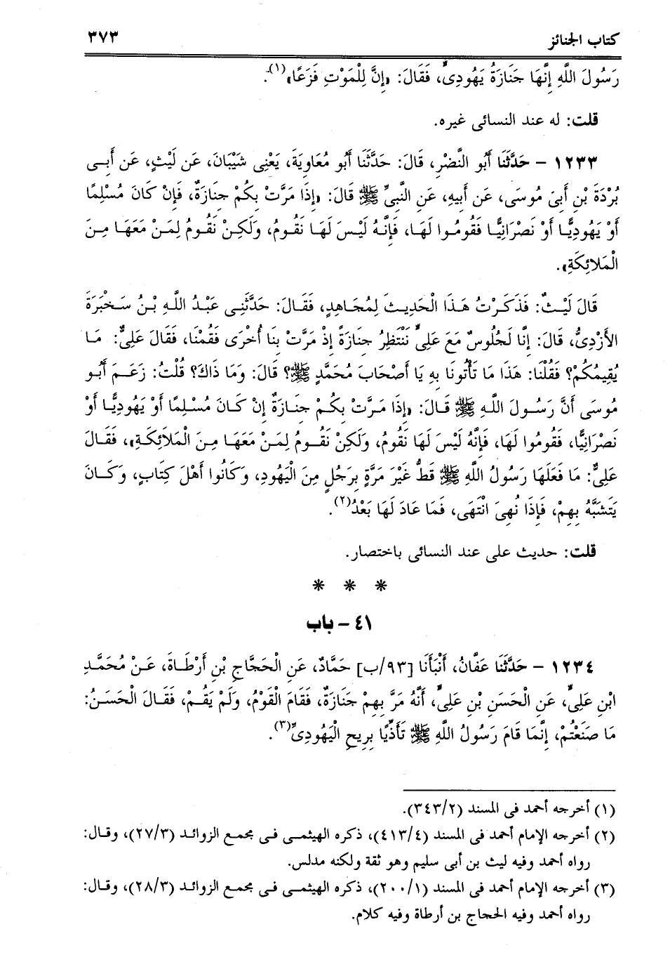 1234 - حَدَّثَنَا عَفَّانُ، أَنْبَأَنَا حَمَّادٌ، عَنِ الْحَجَّاجِ بْنِ أَرْطَاةَ، عَنْ مُحَمَّدِ ابْنِ عَلِىٍّ، عَنِ الْحَسَنِ بْنِ عَلِىٍّ، أَنَّهُ مَرَّ بِهِمْ جَنَازَةٌ، فَقَامَ الْقَوْمُ، وَلَمْ يَقُمْ، فَقَالَ الْحَسَنُ: مَا صَنَعْتُمْ، إِنَّمَا قَامَ رَسُولُ اللَّهِ صلى الله عليه وسلم تَأَذِّيًا بِرِيحِ الْيَهُودِىِّ. -[374]-