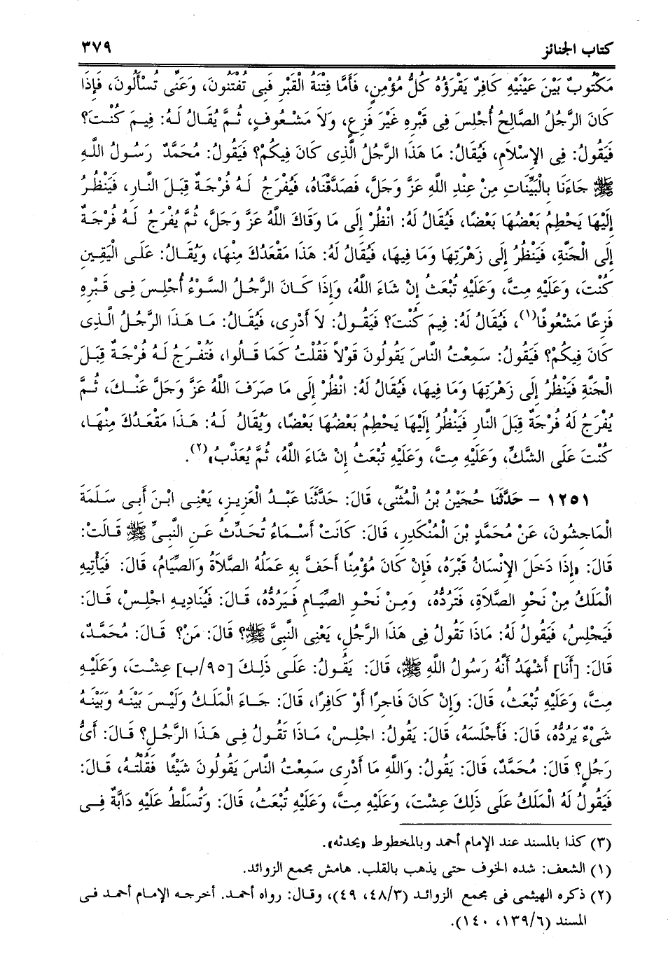 1251 - حَدَّثَنَا حُجَيْنُ بْنُ الْمُثَنَّى، قَالَ: حَدَّثَنَا عَبْدُ الْعَزِيزِ، يَعْنِى ابْنَ أَبِى سَلَمَةَ الْمَاجِشُونَ، عَنْ مُحَمَّدٍ بْنَ الْمُنْكَدِرِ، قَالَ: كَانَتْ أَسْمَاءُ تُحَدِّثُ عَنِ النَّبِىِّ صلى الله عليه وسلم قَالَتْ: قَالَ: "إِذَا دَخَلَ الإِنْسَانُ قَبْرَهُ، فَإِنْ كَانَ مُؤْمِنًا أَحَفَّ بِهِ عَمَلُهُ الصَّلاَةُ وَالصِّيَامُ، قَالَ: فَيَأْتِيهِ الْمَلَكُ مِنْ نَحْوِ الصَّلاَةِ، فَتَرُدُّهُ، وَمِنْ نَحْوِ الصِّيَامِ فَيَرُدُّهُ، قَالَ: فَيُنَادِيهِ اجْلِسْ، قَالَ: فَيَجْلِسُ، فَيَقُولُ لَهُ: مَاذَا تَقُولُ فِى هَذَا الرَّجُلِ، يَعْنِى النَّبِىَّ صلى الله عليه وسلم؟ قَالَ: مَنْ؟ قَالَ: مُحَمَّدٌ، قَالَ: [أَنَا] أَشْهَدُ أَنَّهُ رَسُولُ اللَّهِ صلى الله عليه وسلم، قَالَ: يَقُولُ: عَلَى ذَلِكَ عِشْتَ، وَعَلَيْهِ مِتَّ، وَعَلَيْهِ تُبْعَثُ، قَالَ: وَإِنْ كَانَ فَاجِرًا أَوْ كَافِرًا، قَالَ: جَاءَ الْمَلَكُ وَلَيْسَ بَيْنَهُ وَبَيْنَهُ شَىْءٌ يَرُدُّهُ، قَالَ: فَأَجْلَسَهُ، قَالَ: يَقُولُ: اجْلِسْ، مَاذَا تَقُولُ فِى هَذَا الرَّجُلِ؟ قَالَ: أَىُّ رَجُلٍ؟ قَالَ: مُحَمَّدٌ، قَالَ: يَقُولُ: وَاللَّهِ مَا أَدْرِى سَمِعْتُ النَّاسَ يَقُولُونَ شَيْئًا فَقُلْتُهُ، قَالَ: فَيَقُولُ لَهُ الْمَلَكُ عَلَى ذَلِكَ عِشْتَ، وَعَلَيْهِ مِتَّ، وَعَلَيْهِ تُبْعَثُ، قَالَ: وَتُسَلَّطُ عَلَيْهِ دَابَّةٌ فِى -[380]- قَبْرِهِ مَعَهَا سَوْطٌ تَمْرَتُهُ جَمْرَةٌ مِثْلُ غَرْبِ الْبَعِيرِ تَضْرِبُهُ مَا شَاءَ اللَّهُ، صَمَّاءُ لاَ تَسْمَعُ صَوْتَهُ فَتَرْحَمَهُ.