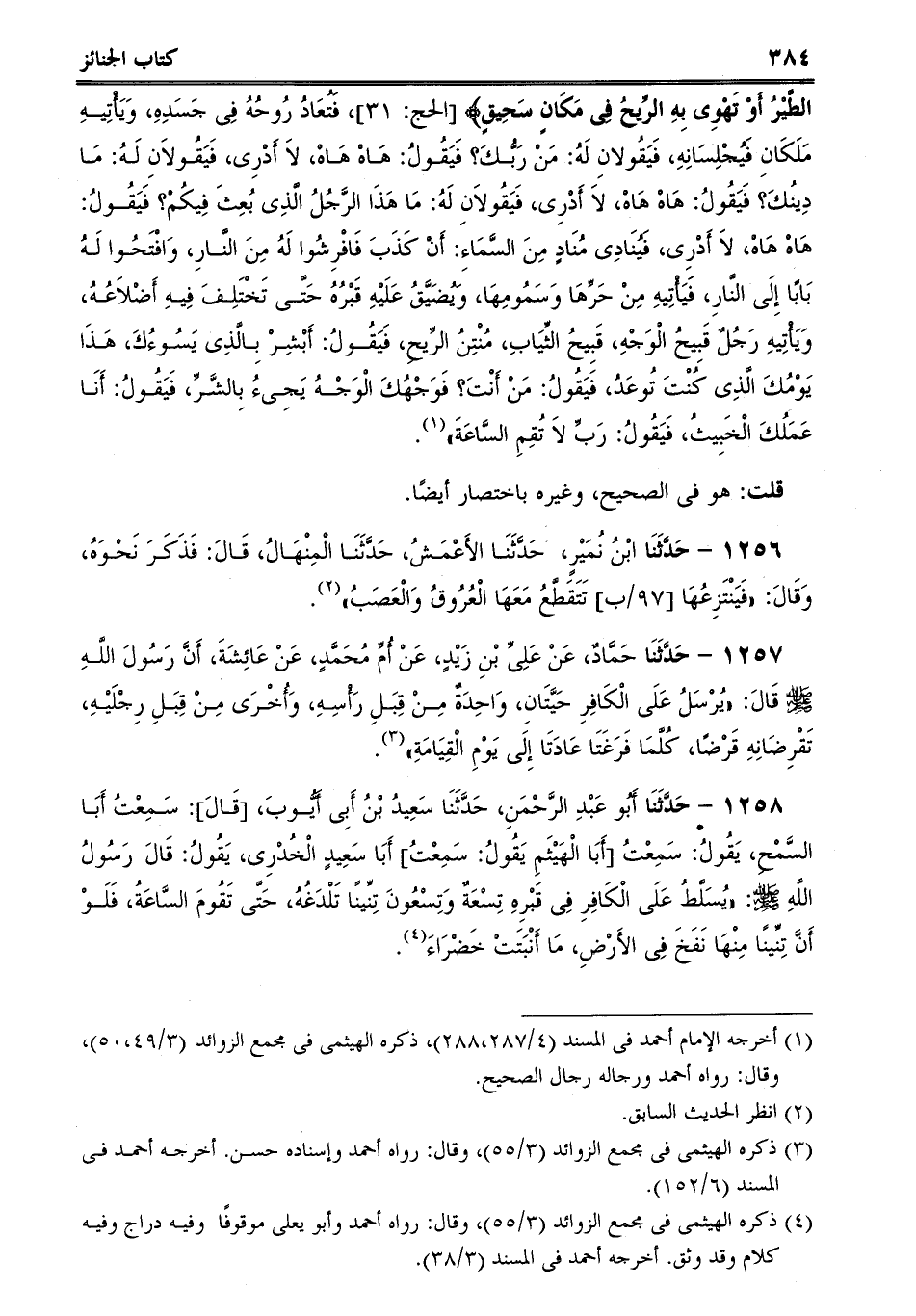 1256 - حَدَّثَنَا ابْنُ نُمَيْرٍ، حَدَّثَنَا الأَعْمَشُ، حَدَّثَنَا الْمِنْهَالُ، قَالَ: فَذَكَرَ نَحْوَهُ، وَقَالَ: "فَيَنْتَزِعُهَا تَتَقَطَّعُ مَعَهَا الْعُرُوقُ وَالْعَصَبُ.