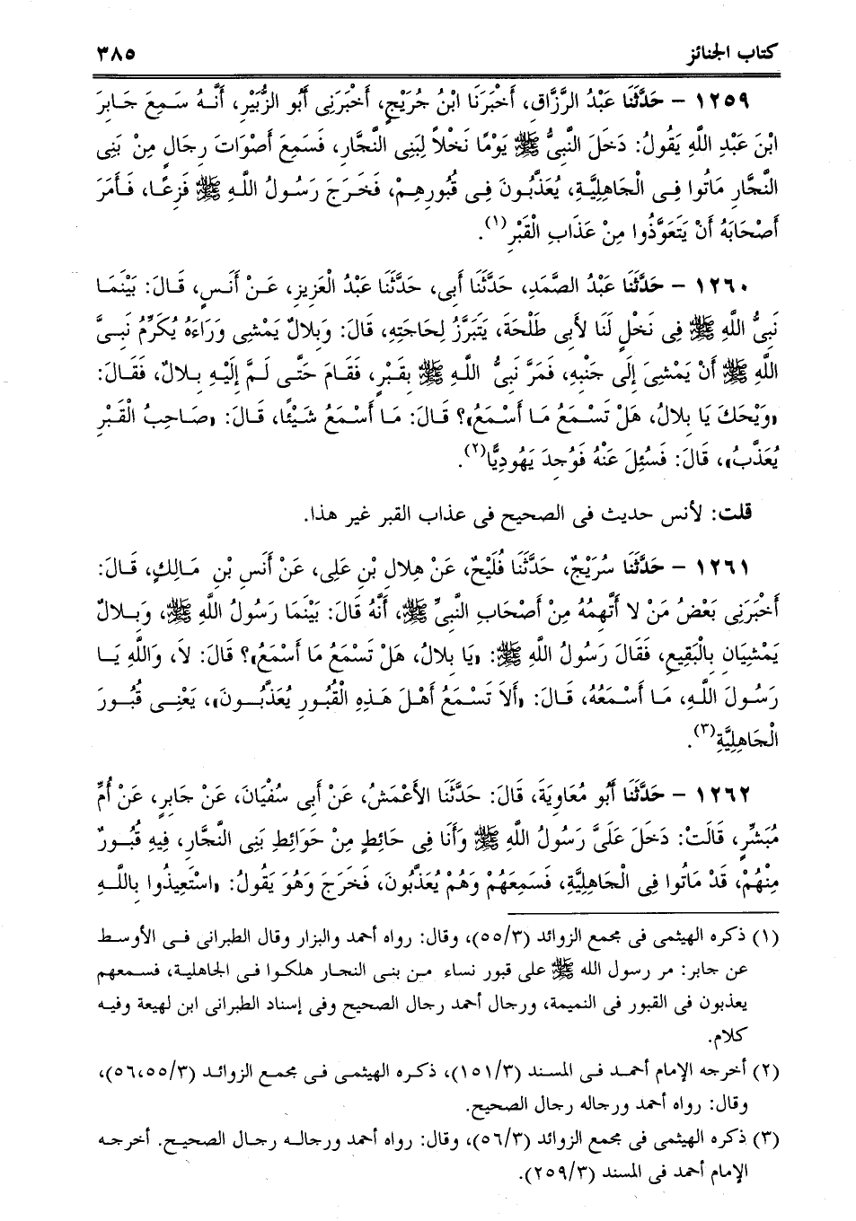 1259 - حَدَّثَنَا عَبْدُ الرَّزَّاقِ، أَخْبَرَنَا ابْنُ جُرَيْجٍ، أَخْبَرَنِى أَبُو الزُّبَيْرِ، أَنَّهُ سَمِعَ جَابِرَ ابْنَ عَبْدِ اللَّهِ يَقُولُ: دَخَلَ النَّبِىُّ صلى الله عليه وسلم يَوْمًا نَخْلاً لِبَنِى النَّجَّارِ، فَسَمِعَ أَصْوَاتَ رِجَالٍ مِنْ بَنِى النَّجَّارِ مَاتُوا فِى الْجَاهِلِيَّةِ، يُعَذَّبُونَ فِى قُبُورِهِمْ، فَخَرَجَ رَسُولُ اللَّهِ صلى الله عليه وسلم فَزِعًا، فَأَمَرَ أَصْحَابَهُ أَنْ يَتَعَوَّذُوا مِنْ عَذَابِ الْقَبْرِ.