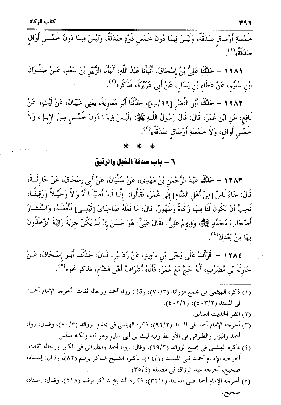 1283 - حَدَّثَنَا عَبْدُ الرَّحْمَنِ بْنُ مَهْدِى، عَنْ سُفْيَانَ، عَنْ أَبِى إِسْحَاقَ، عَنْ حَارِثَةَ، قَالَ: جَاءَ نَاسٌ [مِنْ أَهْلِ الشَّامِ] إِلَى عُمَرَ، فَقَالُوا: إِنَّا قَدْ أَصَبْنَا أَمْوَالاً وَخَيْلاً وَرَقِيقًا، نُحِبُّ أَنْ يَكُونَ لَنَا فِيهَا زَكَاةٌ وَطَهُورٌ، قَالَ: مَا فَعَلَهُ صَاحِبَاىَ [قَبْلِى] فَأَفْعَلَهُ، وَاسْتَشَارَ أَصْحَابَ مُحَمَّدٍ صلى الله عليه وسلم، وَفِيهِمْ عَلِىٌّ، فَقَالَ عَلِىٌّ: هُوَ حَسَنٌ إِنْ لَمْ يَكُنْ جِزْيَةً رَاتِبَةً يُؤْخَذُونَ بِهَا مِنْ بَعْدِكَ.