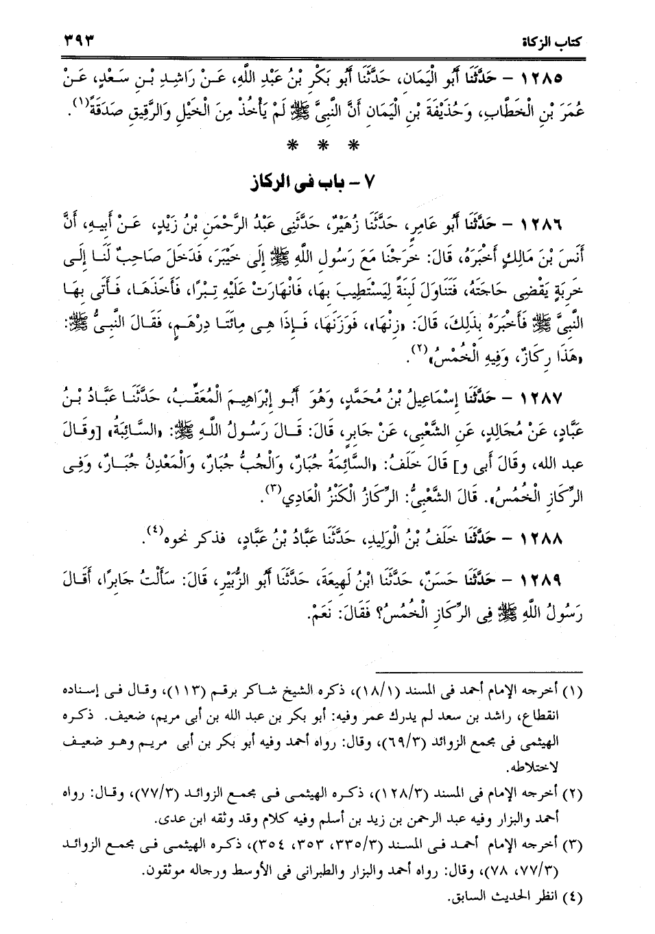 1287 - حَدَّثَنَا إِسْمَاعِيلُ بْنُ مُحَمَّدٍ، وَهُوَ أَبُو إِبْرَاهِيمَ الْمُعَقِّبُ، حَدَّثَنَا عَبَّادُ بْنُ عَبَّادٍ، عَنْ مُجَالِدٍ، عَنِ الشَّعْبِى، عَنْ جَابِرٍ، قَالَ: قَالَ رَسُولُ اللَّهِ صلى الله عليه وسلم: "السَّائِبَةُ [وقَالَ عبد الله، وقَالَ أَبى و] قَالَ خَلَفُ: "السَّائِمَةُ جُبَارٌ، وَالْجُبُّ جُبَارٌ، وَالْمَعْدِنُ جُبَارٌ، وَفِى الرِّكَازِ الْخُمُسُ. قَالَ الشَّعْبِىُّ: الرِّكَازُ الْكَنْزُ الْعَادِي.