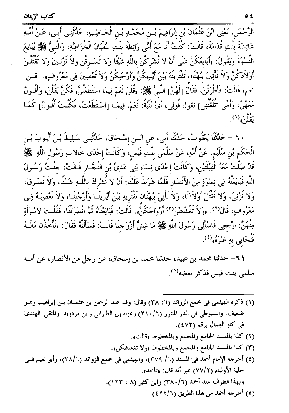 60 - حَدَّثَنَا يَعْقُوبُ، حَدَّثَنَا أَبِى، عَنِ ابْنِ إِسْحَاقَ، حَدَّثَنِى سَلِيطُ بْنُ أَيُّوبَ بْنِ الْحَكَمِ بْنِ سُلَيْمٍ، عَنْ أُمِّهِ، عَنْ سَلْمَى بِنْتِ قَيْسٍ، وَكَانَتْ إِحْدَى خَالاتِ رَسُولِ اللَّهِ صلى الله عليه وسلم قَدْ صَلَّتْ مَعَهُ الْقِبْلَتَيْنِ، وَكَانَتْ إِحْدَى نِسَاءِ بَنِى عَدِىِّ بْنِ النَّجَّارِ قَالَتْ: جِئْتُ رَسُولَ اللَّهِ فَبَايَعْتُهُ فِى نِسْوَةٍ مِنَ الأَنْصَارِ فَلَمَّا شَرَطَ عَلَيْنَا: أَنْ لا نُشْرِكَ بِاللَّهِ شَيْئًا، وَلاَ نَسْرِقَ، وَلا نَزْنِىَ، وَلا نَقْتُلَ أَوْلاَدَنَا، وَلاَ نَأْتِىَ بِبُهْتَانٍ نَفْتَرِيهِ بَيْنَ أَيْدِينَا وَأَرْجُلِنَا، وَلاَ نَعْصِيَهُ فِى مَعْرُوفٍ، قَالَ: "وَلاَ تَغْشُشْنَ أَزْوَاجَكُنَّ. قَالَتْ: فَبَايَعْنَاهُ ثُمَّ انْصَرَفْنَا، فَقُلْتُ لامْرَأَةٍ مِنْهُنَّ: ارْجِعِى فَاسْأَلِى رَسُولَ اللَّهِ صلى الله عليه وسلم مَا غِشُّ أَزْوَاجِنَا قَالَتْ: فَسَأَلَتْهُ فَقَالَ: "تَأْخُذُن مَالَهُ فَتُحَابِى بِهِ غَيْرَهُ.