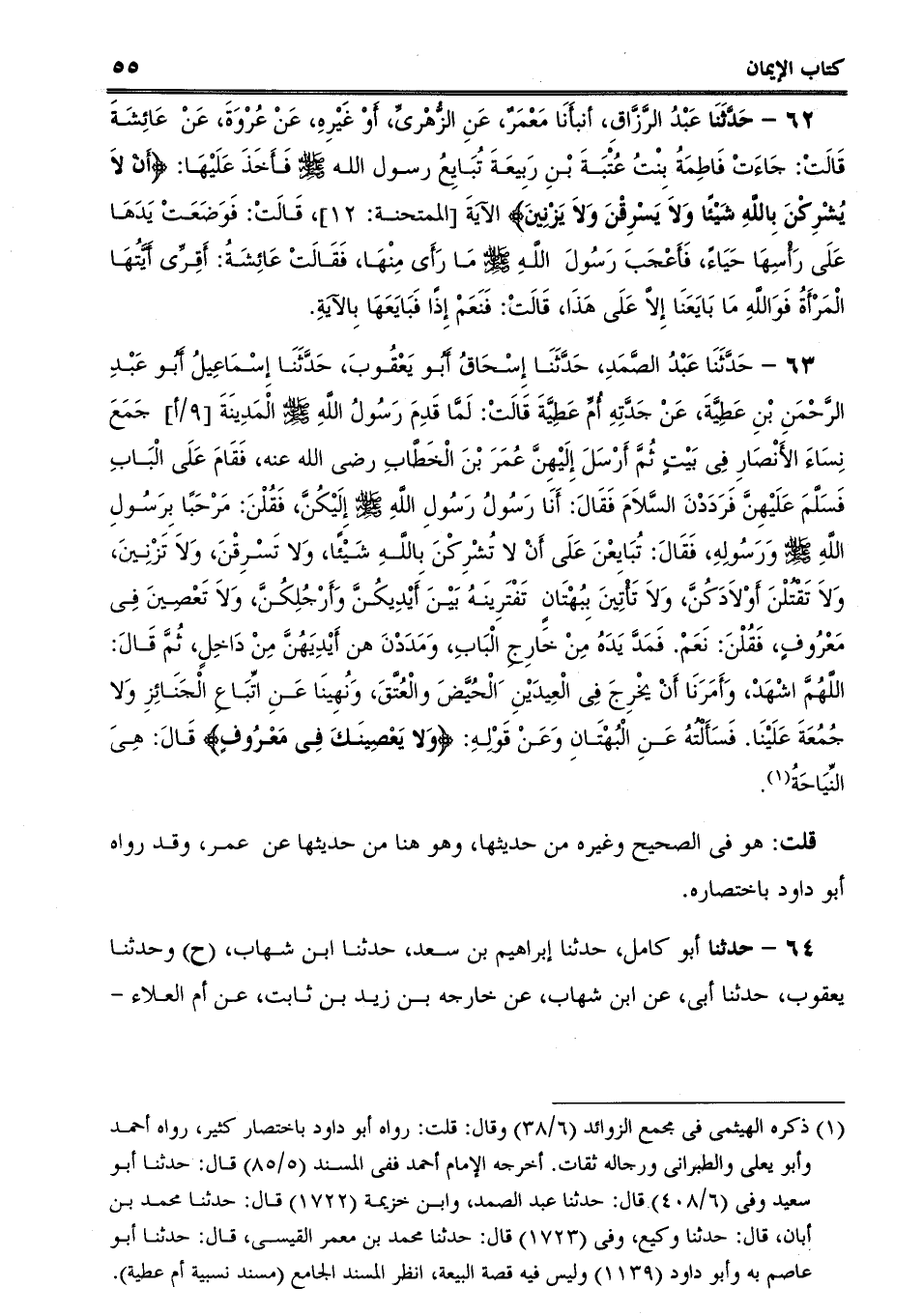64 - حدثنا أبو كامل، حدثنا إبراهيم بن سعد، حدثنا ابن شهاب، (ح) وحدثنا يعقوب، حدثنا أبى، عن ابن شهاب، عن خارجه بن زيد بن ثابت، عن أم العلاء -[56]- وهى امرأة من نسائهم - قال يعقوب: أخبر به كذا بايعت رسول الله صلى الله عليه وسلم.
