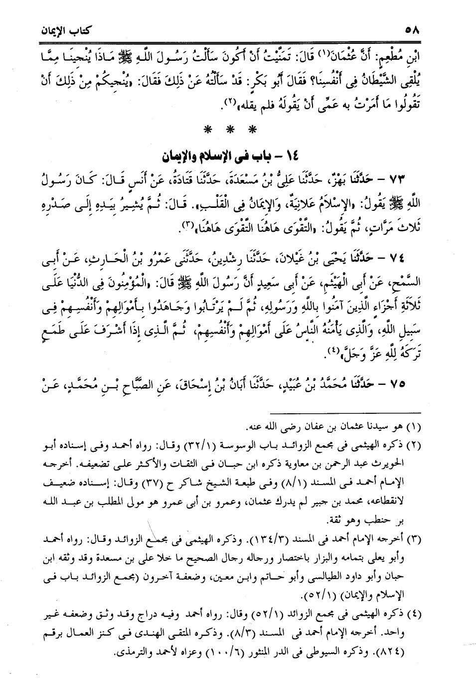 73 - حَدَّثَنَا بَهْزٌ، حَدَّثَنَا عَلِىُّ بْنُ مَسْعَدَةَ، حَدَّثَنَا قَتَادَةُ، عَنْ أَنَسٍ قَالَ: كَانَ رَسُولُ اللَّهِ صلى الله عليه وسلم يَقُولُ: "الإِسْلاَمُ عَلانِيَةٌ، وَالإِيمَانُ فِى الْقَلْبِ. قَالَ: ثُمَّ يُشِيرُ بِيَدِهِ إِلَى صَدْرِهِ ثَلاثَ مَرَّاتٍ، ثُمَّ يَقُولُ: "التَّقْوَى هَاهُنَا التَّقْوَى هَاهُنَا.