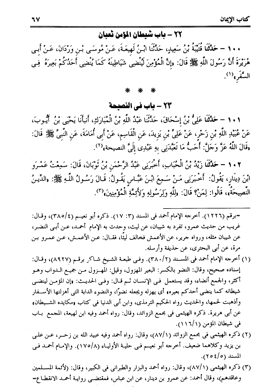 100 - حَدَّثَنَا قُتَيْبَةُ بْنُ سَعِيدٍ، حَدَّثَنَا ابْنُ لَهِيعَةَ، عَنْ مُوسَى بْنِ وَرْدَانَ، عَنْ أَبِى هُرَيْرَةَ أَنَّ رَسُولَ اللَّهِ صلى الله عليه وسلم قَالَ: "إِنَّ الْمُؤْمِنَ لَيُنْضِى شَيَاطِينَهُ كَمَا يُنْضِى أَحَدُكُمْ بَعِيرَهُ فِى السَّفَرِ.