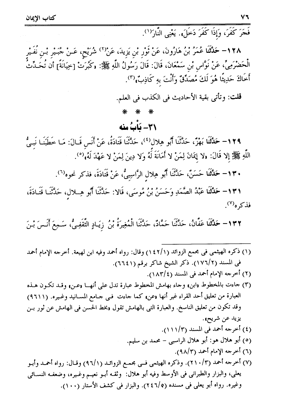 129 - حَدَّثَنَا بَهْزٌ، حَدَّثَنَا أَبُو هِلالٍ، حَدَّثَنَا قَتَادَةُ، عَنْ أَنَسِ قَالَ: مَا خَطَبَنَا نَبِىُّ اللَّهِ صلى الله عليه وسلم إِلا قَالَ: "لا إِيمَانَ لِمَنْ لا أَمَانَةَ لَهُ وَلا دِينَ لِمَنْ لا عَهْدَ لَهُ.