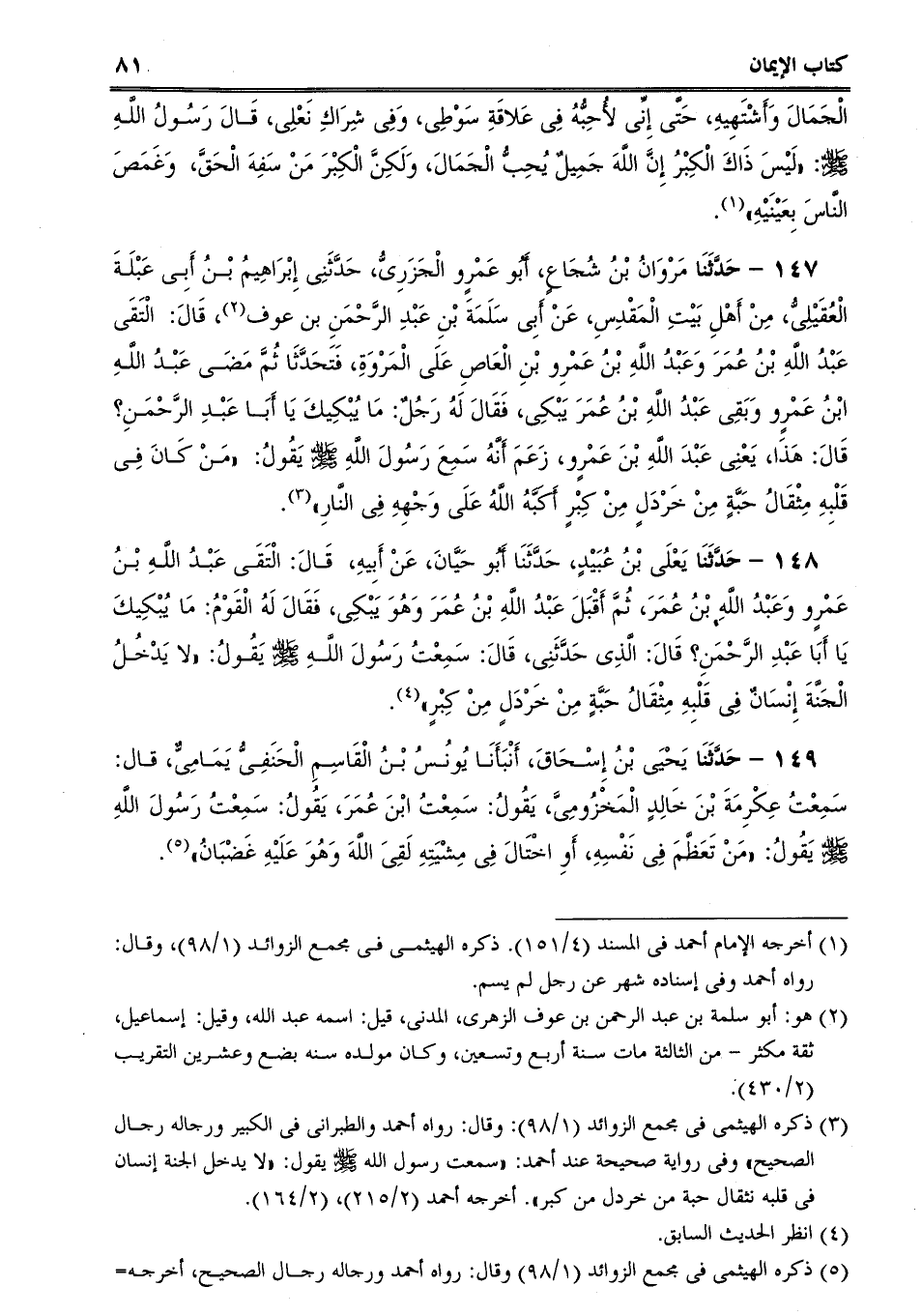147 - حَدَّثَنَا مَرْوَانُ بْنُ شُجَاعٍ، أَبُو عَمْرٍو الْجَزَرِىُّ، حَدَّثَنِى إِبْرَاهِيمُ بْنُ أَبِى عَبْلَةَ الْعُقَيْلِىُّ، مِنْ أَهْلِ بَيْتِ الْمَقْدِسِ، عَنْ أَبِى سَلَمَةَ بْنِ عَبْدِ الرَّحْمَنِ بن عوف، قَالَ: الْتَقَى عَبْدُ اللَّهِ بْنُ عُمَرَ وَعَبْدُ اللَّهِ بْنُ عَمْرِو بْنِ الْعَاصِ عَلَى الْمَرْوَةِ، فَتَحَدَّثَا ثُمَّ مَضَى عَبْدُ اللَّهِ ابْنُ عَمْرٍو وَبَقِى عَبْدُ اللَّهِ بْنُ عُمَرَ يَبْكِى، فَقَالَ لَهُ رَجُلٌ: مَا يُبْكِيكَ يَا أَبَا عَبْدِ الرَّحْمَنِ؟ قَالَ: هَذَا، يَعْنِى عَبْدَ اللَّهِ بْنَ عَمْرٍو، زَعَمَ أَنَّهُ سَمِعَ رَسُولَ اللَّهِ صلى الله عليه وسلم يَقُولُ: "مَنْ كَانَ فِى قَلْبِهِ مِثْقَالُ حَبَّةٍ مِنْ خَرْدَلٍ مِنْ كِبْرٍ أَكَبَّهُ اللَّهُ عَلَى وَجْهِهِ فِى النَّارِ.