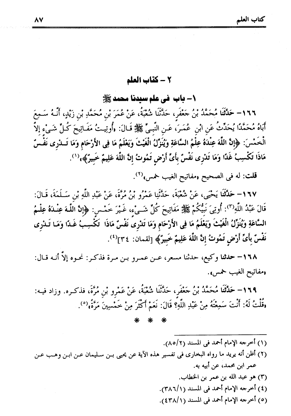 168 - حدثنا وكيع، حدثنا مسعر، عن عمرو بن مرة فذكر: نحوه إلاَّ أنه قال: "مفاتيح الغيب خمس.