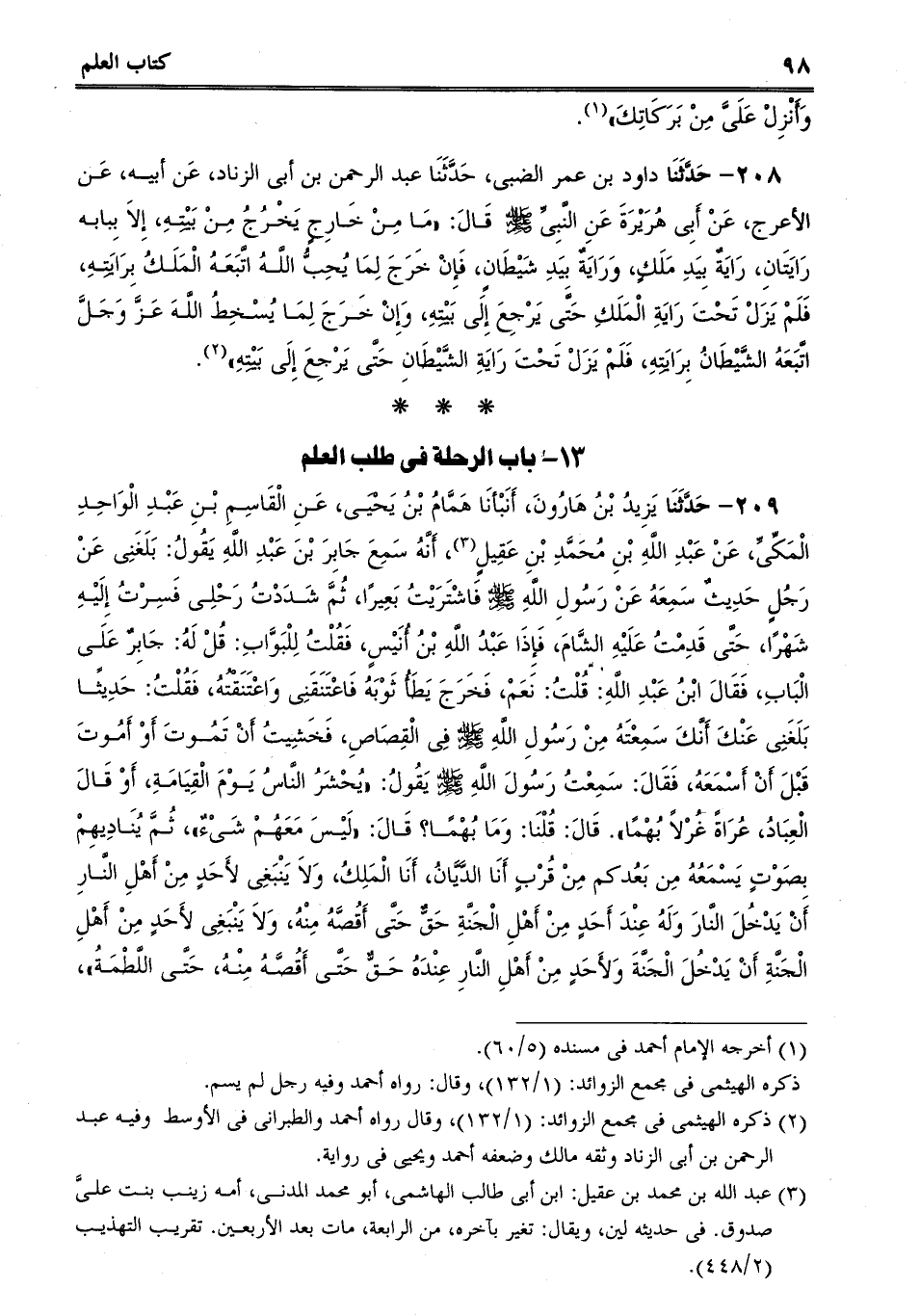 209 - حَدَّثَنَا يَزِيدُ بْنُ هَارُونَ، أَنَبْأنَا هَمَّامُ بْنُ يَحْيَى، عَنِ الْقَاسِمِ بْنِ عَبْدِ الْوَاحِدِ الْمَكِّىِّ، عَنْ عَبْدِ اللَّهِ بْنِ مُحَمَّدِ بْنِ عَقِيلٍ، أَنَّهُ سَمِعَ جَابِرَ بْنَ عَبْدِ اللَّهِ يَقُولُ: بَلَغَنِى عَنْ رَجُلٍ حَدِيثٌ سَمِعَهُ عَنْ رَسُولِ اللَّهِ صلى الله عليه وسلم فَاشْتَرَيْتُ بَعِيرًا، ثُمَّ شَدَدْتُ رَحْلِى فَسِرْتُ إِلَيْهِ شَهْرًا، حَتَّى قَدِمْتُ عَلَيْهِ الشَّامَ، فَإِذَا عَبْدُ اللَّهِ بْنُ أُنَيْسٍ، فَقُلْتُ لِلْبَوَّابِ: قُلْ لَهُ: جَابِرٌ عَلَى الْبَابِ، فَقَالَ ابْنُ عَبْدِ اللَّهِ: قُلْتُ: نَعَمْ، فَخَرَجَ يَطَأُ ثَوْبَهُ فَاعْتَنَقَنِى وَاعْتَنَقْتُهُ، فَقُلْتُ: حَدِيثًا بَلَغَنِى عَنْكَ أَنَّكَ سَمِعْتَهُ مِنْ رَسُولِ اللَّهِ صلى الله عليه وسلم فِى الْقِصَاصِ، فَخَشِيتُ أَنْ تَمُوتَ أَوْ أَمُوتَ قَبْلَ أَنْ أَسْمَعَهُ، فَقَالَ: سَمِعْتُ رَسُولَ اللَّهِ صلى الله عليه وسلم يَقُولُ: "يُحْشَرُ النَّاسُ يَوْمَ الْقِيَامَةِ، أَوْ قَالَ الْعِبَادُ، عُرَاةً غُرْلاً بُهْمًا. قَالَ: قُلْنَا: وَمَا بُهْمًا؟ قَالَ: "لَيْسَ مَعَهُمْ شَىْءٌ، ثُمَّ يُنَادِيهِمْ بِصَوْتٍ يَسْمَعُهُ مِن بَعُدكم مِنْ قُرْبٍ أَنَا الدَّيَّانُ، أَنَا الْمَلِكُ، وَلاَ يَنْبَغِى لأَحَدٍ مِنْ أَهْلِ النَّارِ أَنْ يَدْخُلَ النَّارَ وَلَهُ عِنْدَ أَحَدٍ مِنْ أَهْلِ الْجَنَّةِ حَقٌّ حَتَّى أَقُصَّهُ مِنْهُ، وَلاَ يَنْبَغِى لأَحَدٍ مِنْ أَهْلِ الْجَنَّةِ أَنْ يَدْخُلَ الْجَنَّةَ وَلأَحَدٍ مِنْ أَهْلِ النَّارِ عِنْدَهُ حَقٌّ حَتَّى أَقُصَّهُ مِنْهُ، حَتَّى اللَّطْمَةُ، -[99]- قَالَ: قُلْنَا: كَيْفَ هذا وَإِنَّمَا نَأْتِى اللَّهَ عُرَاةً غُرْلاً بُهْمًا؟ قَالَ: "بِالْحَسَنَاتِ وَالسَّيِّئَاتِ.