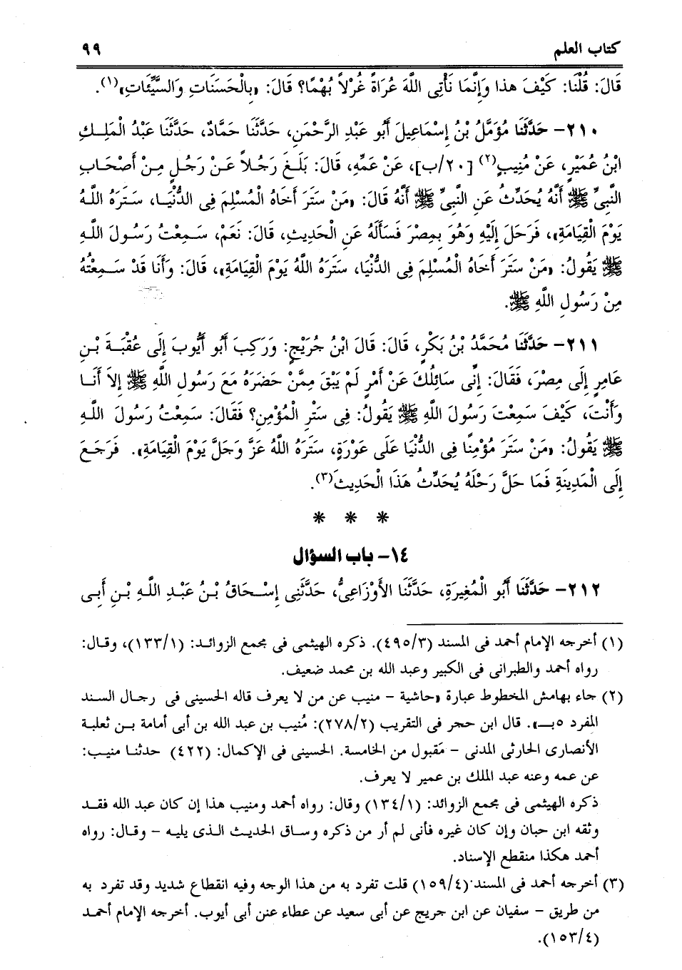 210 - حَدَّثَنَا مُؤَمَّلُ بْنُ إِسْمَاعِيلَ أَبُو عَبْدِ الرَّحْمَنِ، حَدَّثَنَا حَمَّادٌ، حَدَّثَنَا عَبْدُ الْمَلِكِ ابْنُ عُمَيْرٍ، عَنْ مُنِيبٍ، عَنْ عَمِّهِ، قَالَ: بَلَغَ رَجُلاً عَنْ رَجُلٍ مِنْ أَصْحَابِ النَّبِىِّ صلى الله عليه وسلم أَنَّهُ يُحَدِّثُ عَنِ النَّبِىِّ صلى الله عليه وسلم أَنَّهُ قَالَ: "مَنْ سَتَرَ أَخَاهُ الْمُسْلِمَ فِى الدُّنْيَا، سَتَرَهُ اللَّهُ يَوْمَ الْقِيَامَةِ، فَرَحَلَ إِلَيْهِ وَهُوَ بِمِصْرَ فَسَأَلَهُ عَنِ الْحَدِيثِ، قَالَ: نَعَمْ، سَمِعْتُ رَسُولَ اللَّهِ صلى الله عليه وسلم يَقُولُ: "مَنْ سَتَرَ أَخَاهُ الْمُسْلِمَ فِى الدُّنْيَا، سَتَرَهُ اللَّهُ يَوْمَ الْقِيَامَةِ، قَالَ: وَأَنَا قَدْ سَمِعْتُهُ مِنْ رَسُولِ اللَّهِ صلى الله عليه وسلم.