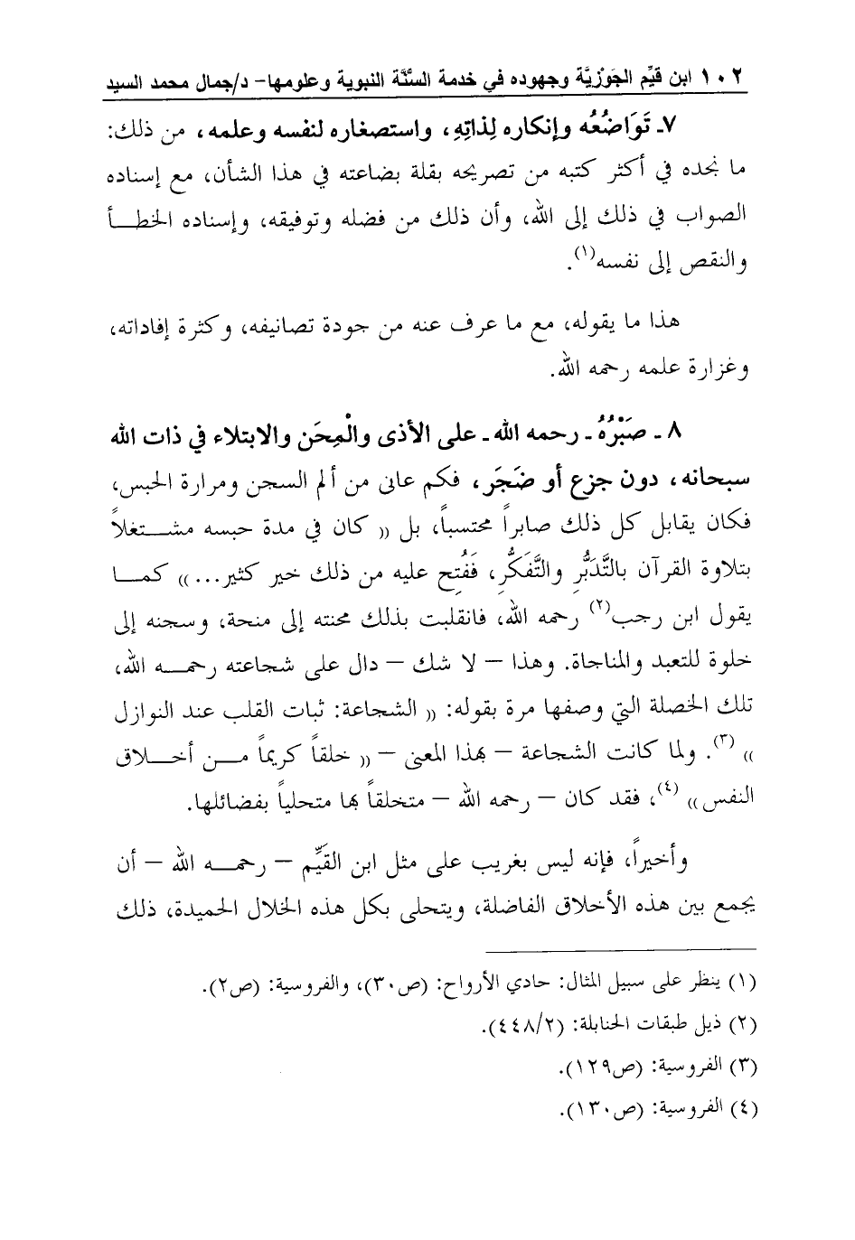 8 - صَبْرُهُ - رحمه الله - على الأذى والْمِحَن والابتلاء في ذات الله سبحانه، دون جزع أو ضَجَر، فكم عانى من ألم السجن ومرارة الحبس، فكان يقابل كل ذلك صابراً محتسباً، بل "كان في مدة حبسه مشتغلاً بتلاوة القرآن بالتَّدَبُّرِ والتَّفَكُّرِ، فَفُتِح عليه من ذلك خير كثير ... " كما يقول ابن رجب2 رحمه الله، فانقلبت بذلك محنته إلى منحة، وسجنه إلى خلوة للتعبد والمناجاة. وهذا - لا شك - دال على شجاعته رحمه الله، تلك الخصلة التي وصفها مرة بقوله: "الشجاعة: ثبات القلب عند النوازل"3. ولما كانت الشجاعة - بهذا المعنى - "خلقاً كريماً من أخلاق النفس"4، فقد كان - رحمه الله - متخلقاً بها متحلياً بفضائلها.