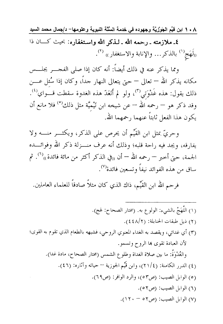 4ـ ملازمته - رحمه الله - لذكر الله واستغفاره: بحيث كان ذا (لَهَجٍ1 بالذكر ... والإنابة والاستغفار"2.