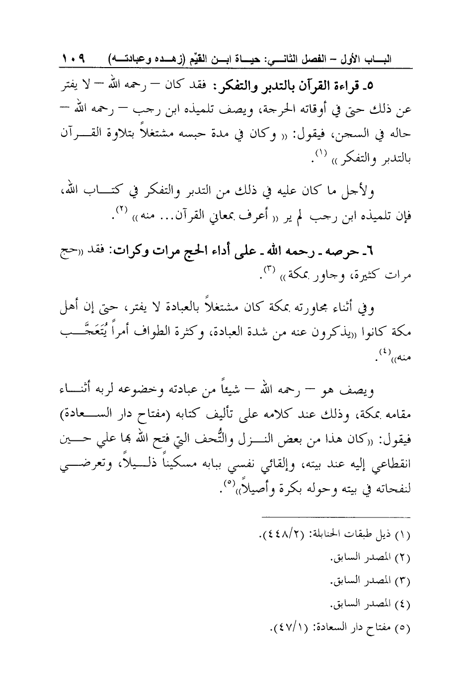 5ـ قراءة القرآن بالتدبر والتفكر: فقد كان - رحمه الله - لا يفتر عن ذلك حتى في أوقاته الحرجة، ويصف تلميذه ابن رجب - رحمه الله - حاله في السجن، فيقول: "وكان في مدة حبسه مشتغلاً بتلاوة القرآن بالتدبر والتفكر"1.