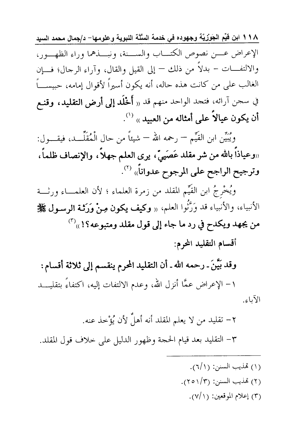 وقد بَيَّنَ - رحمه الله - أن التقليد المحرم ينقسم إلى ثلاثة أقسام: