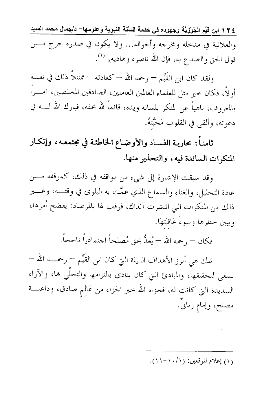 تلك هي أبرز الأهداف النبيلة التي كان ابن القَيِّم - رحمه الله - يسعى لتحقيقها، والمبادئ التي كان ينادي بالتزامها والتحلِّي بها، والآراء السديدة التي كانت له، فجزاه الله خير الجزاء من عَالِمٍ صادق، وداعية مصلح، وإمامٍ ربانيِّ.