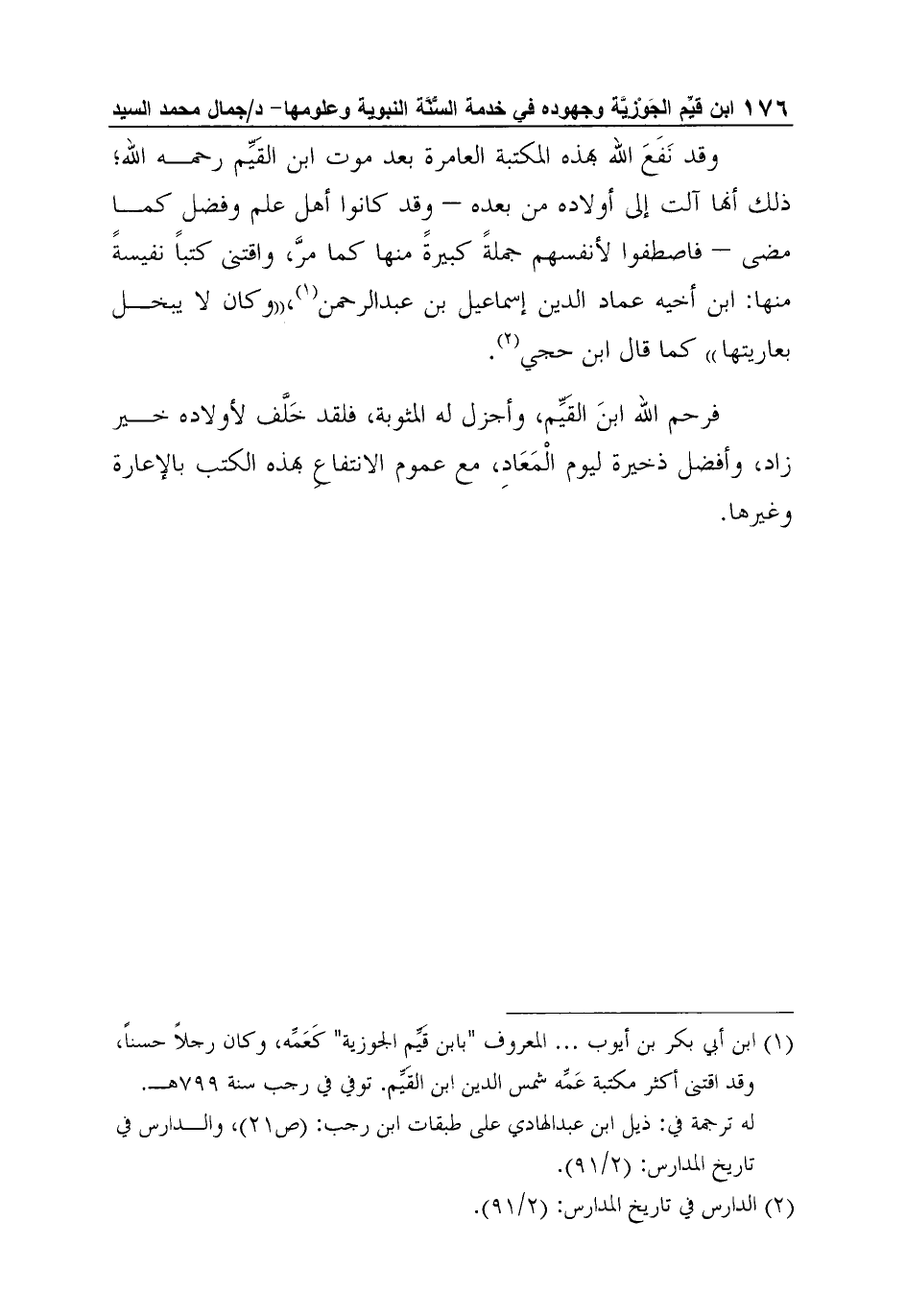 فرحم الله ابنَ القَيِّم، وأجزل له المثوبة، فلقد خَلَّف لأولاده خير زاد، وأفضل ذخيرة ليوم الْمَعَادِ، مع عموم الانتفاعِ بهذه الكتب بالإعارة وغيرها.