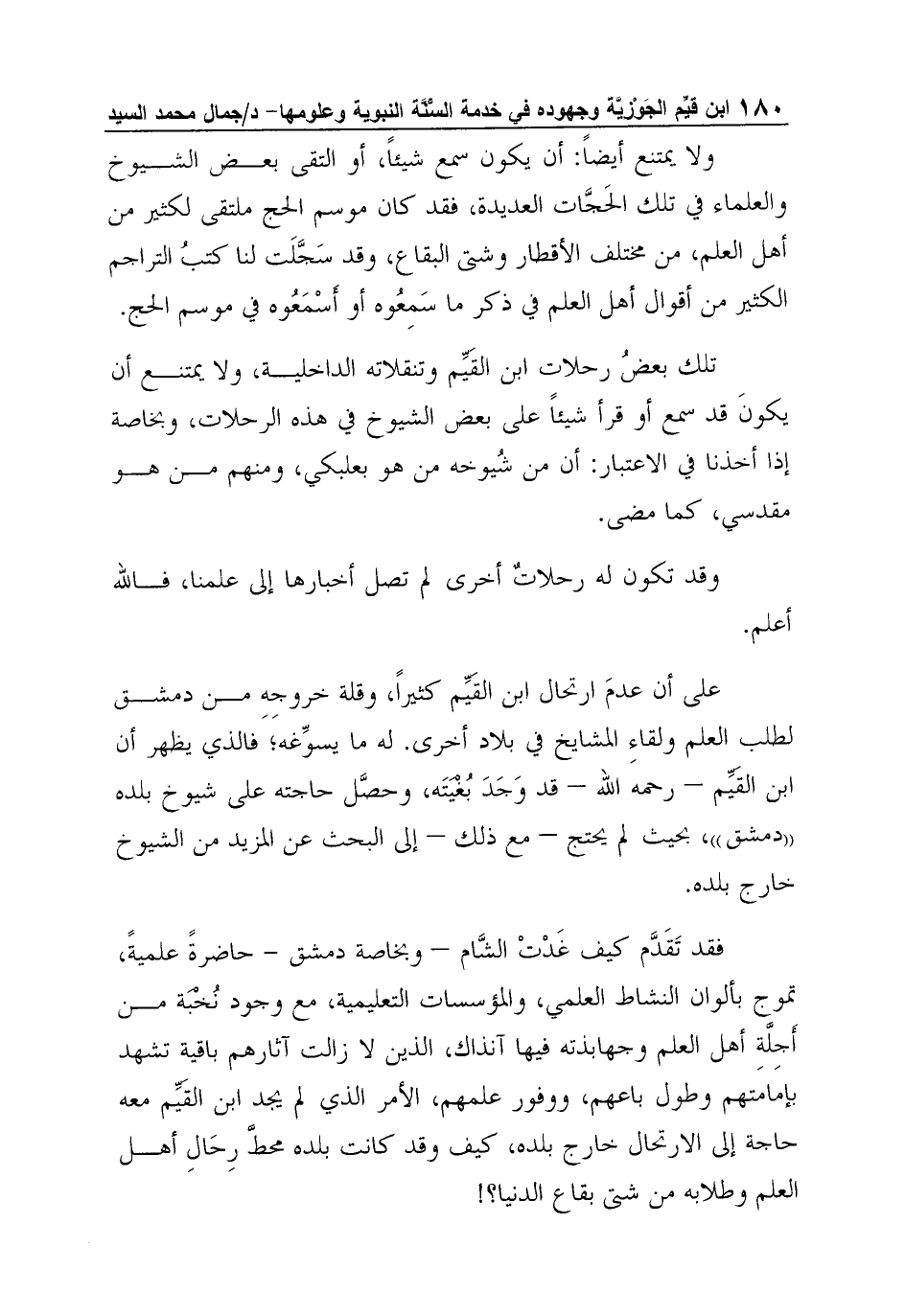 تلك بعضُ رحلات ابن القَيِّم وتنقلاته الداخلية، ولا يمتنع أن يكونَ قد سمع أو قرأ شيئاً على بعض الشيوخ في هذه الرحلات، وبخاصة إذا أخذنا في الاعتبار: أن من شُيوخه من هو بعلبكي، ومنهم من هو مقدسي، كما مضى.