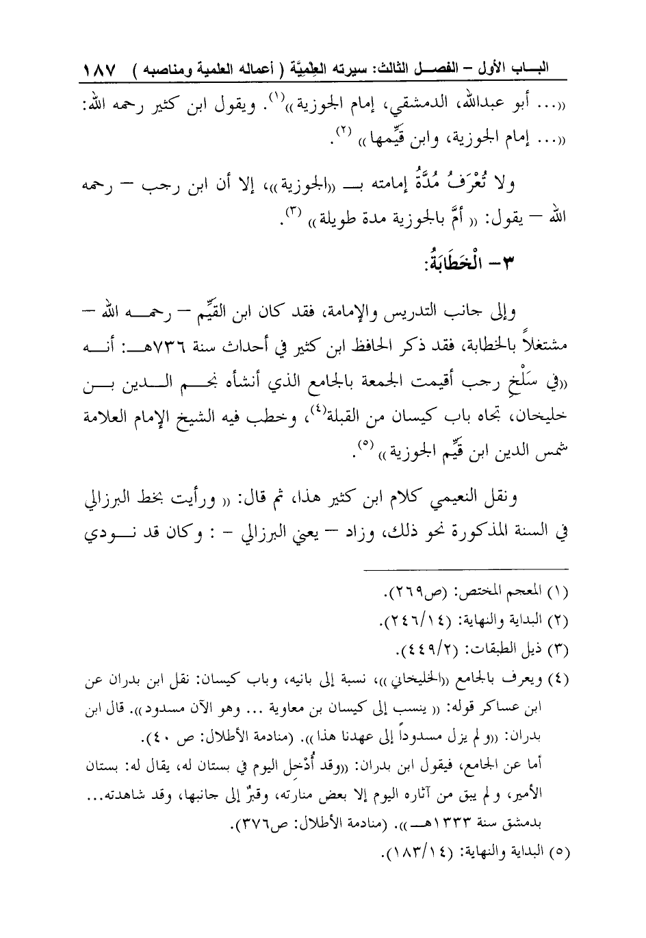 " ... أبو عبد الله، الدمشقي، إمام الجوزية"1. ويقول ابن كثير رحمه الله: " ... إمام الجوزية، وابن قَيِّمها"2.