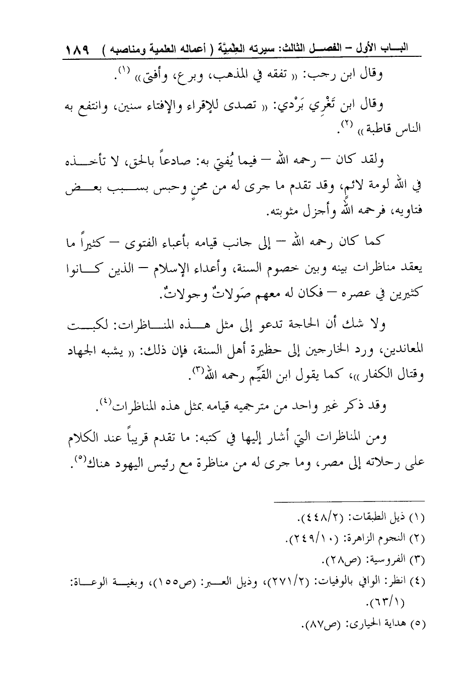 ومن المناظرات التي أشار إليها في كتبه: ما تقدم قريباً عند الكلام على رحلاته إلى مصر، وما جرى له من مناظرة مع رئيس اليهود هناك5.