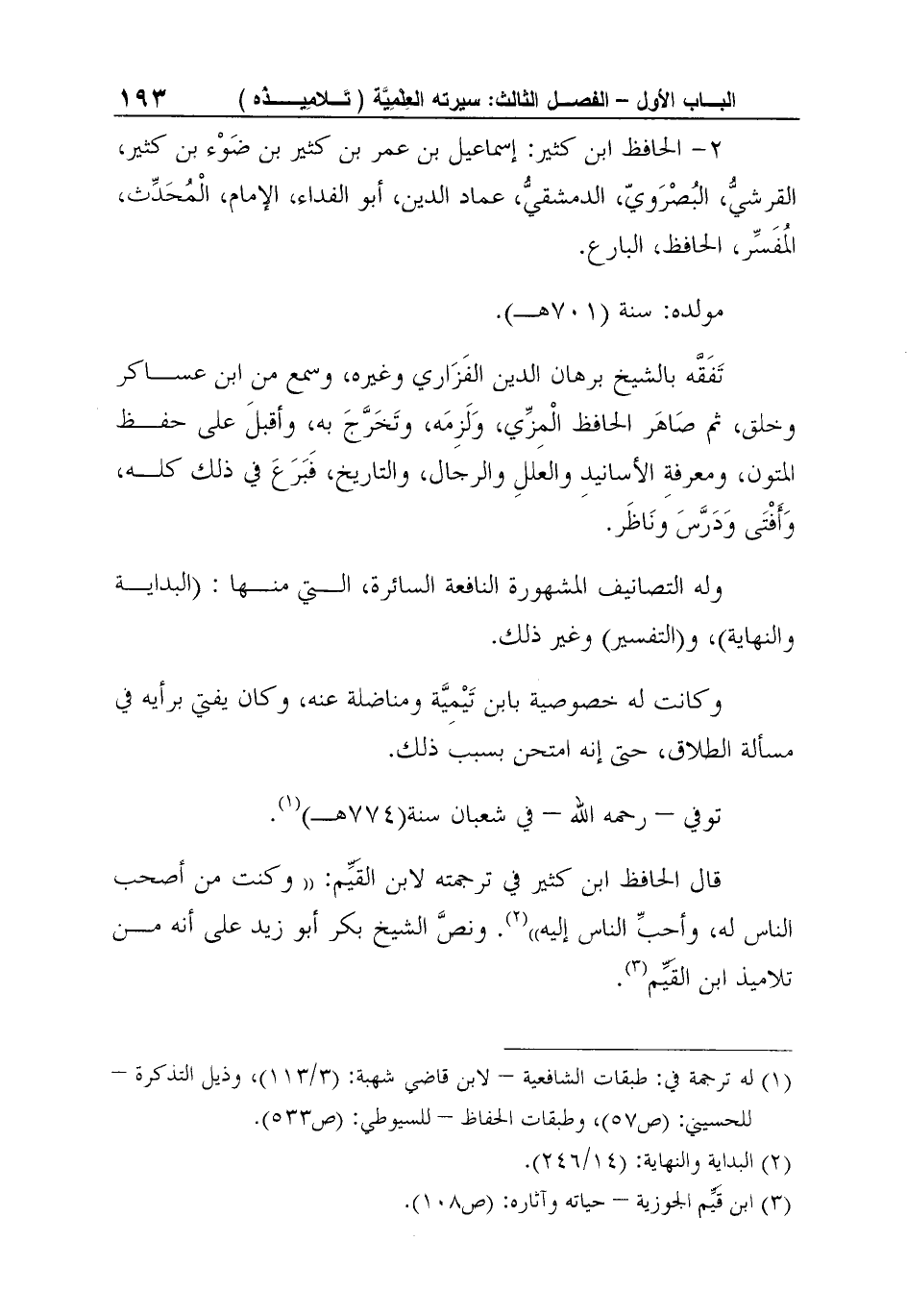 2- الحافظ ابن كثير: إسماعيل بن عمر بن كثير بن ضَوْء بن كثير، القرشيُّ، البُصْرَويّ، الدمشقيُّ، عماد الدين، أبو الفداء، الإمام، الْمُحَدِّث، المُفَسِّر، الحافظ، البارع.