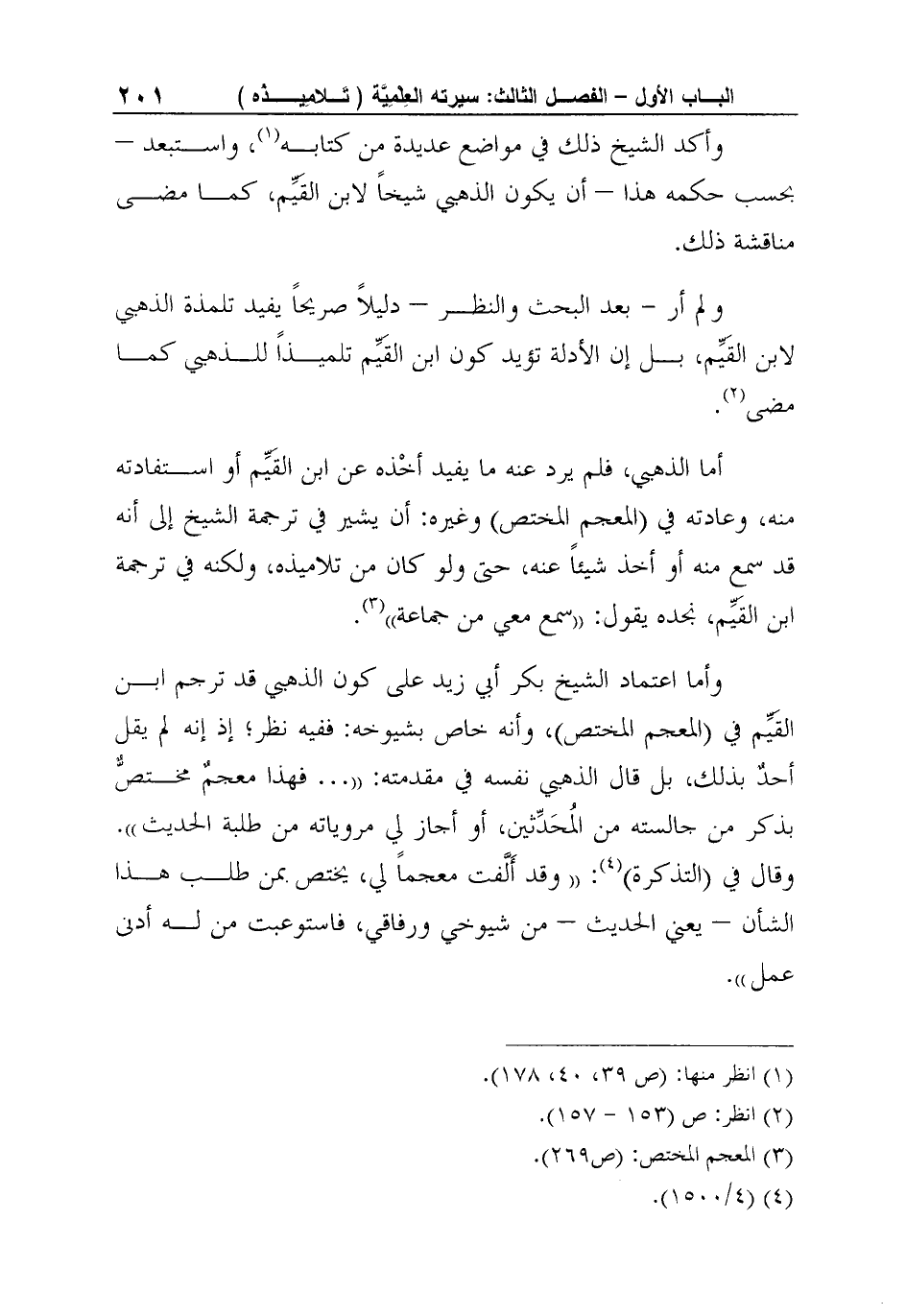 وأما اعتماد الشيخ بكر أبي زيد على كون الذهبي قد ترجم ابن القَيِّم في (المعجم المختص) ، وأنه خاص بشيوخه: ففيه نظر؛ إذ إنه لم يقل أحدٌ بذلك، بل قال الذهبي نفسه في مقدمته: "… فهذا معجمٌ مختصٌّ بذكر من جالسته من المُحَدِّثين، أو أجاز لي مروياته من طلبة الحديث". وقال في (التذكرة) 4: "وقد أَلَّفت معجماً لي، يختص بمن طلب هذا الشأن - يعني الحديث - من شيوخي ورفاقي، فاستوعبت من له أدنى عمل".