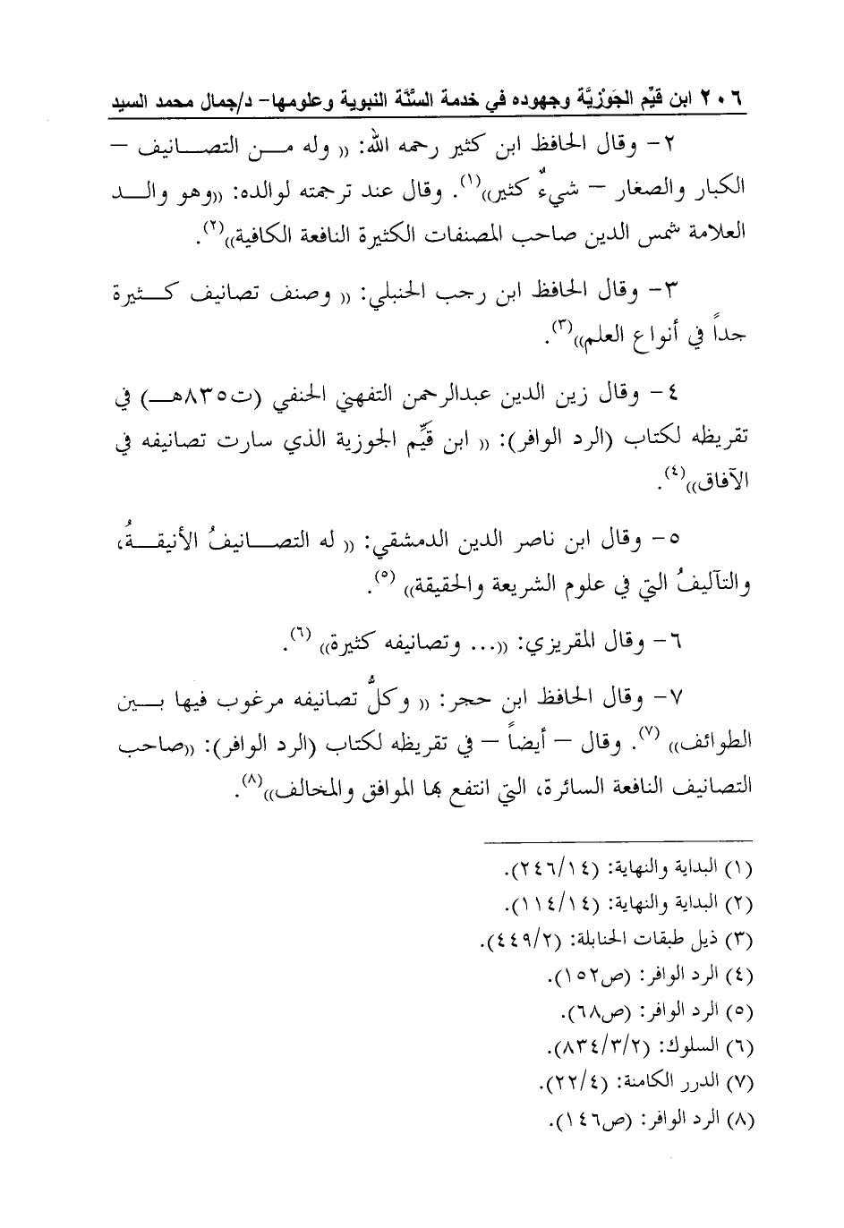 4- وقال زين الدين عبد الرحمن التفهني الحنفي (ت835هـ) في تقريظه لكتاب (الرد الوافر) : "ابن قَيِّم الجوزية الذي سارت تصانيفه في الآفاق"4.