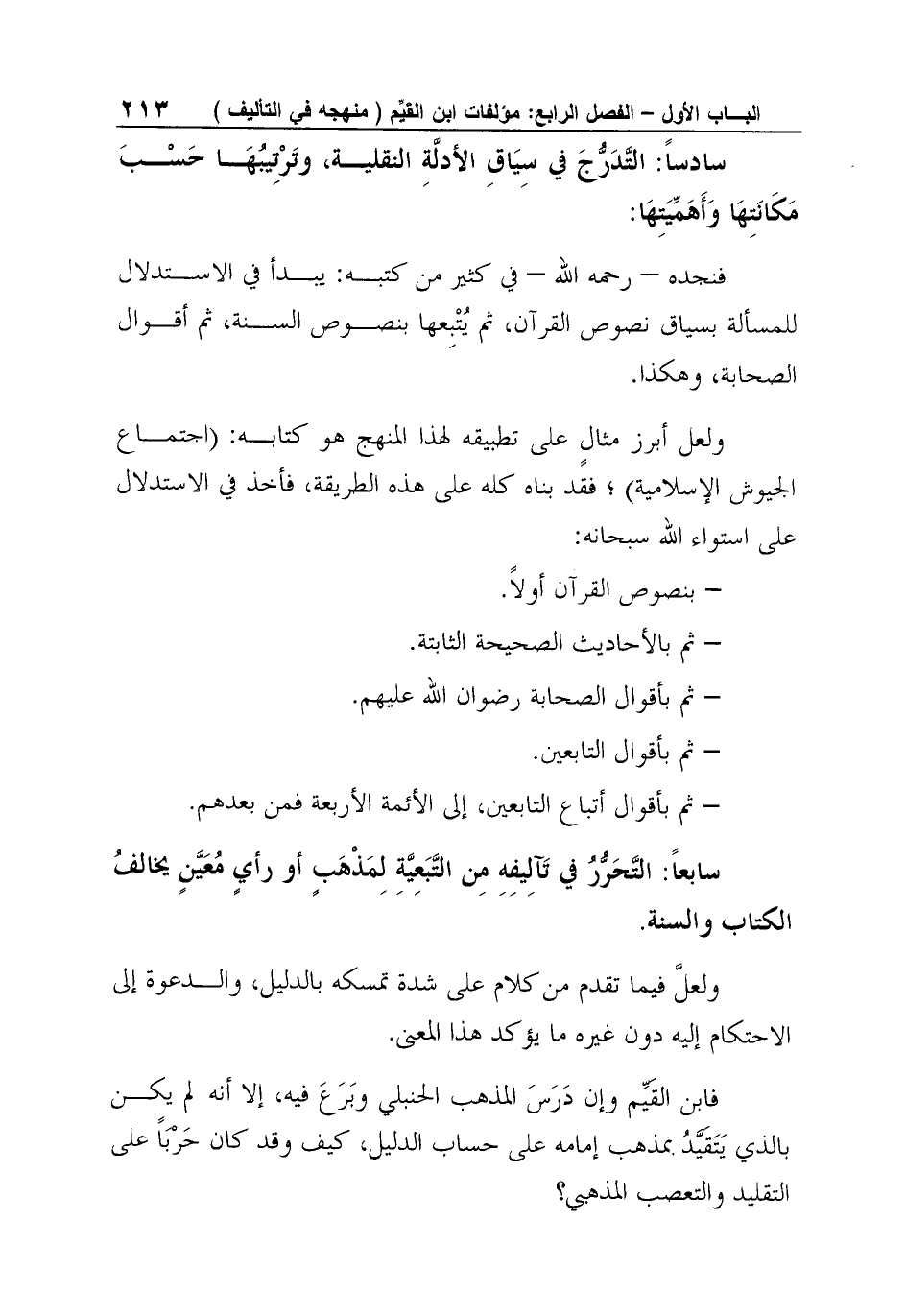 سابعاً: التَّحَرُّرُ في تَآلِيفِهِ مِن التَّبَعِيَّةِ لِمَذْهَبٍ أو رأيٍ مُعَيَّنٍ يخالفُ الكتاب والسنة.