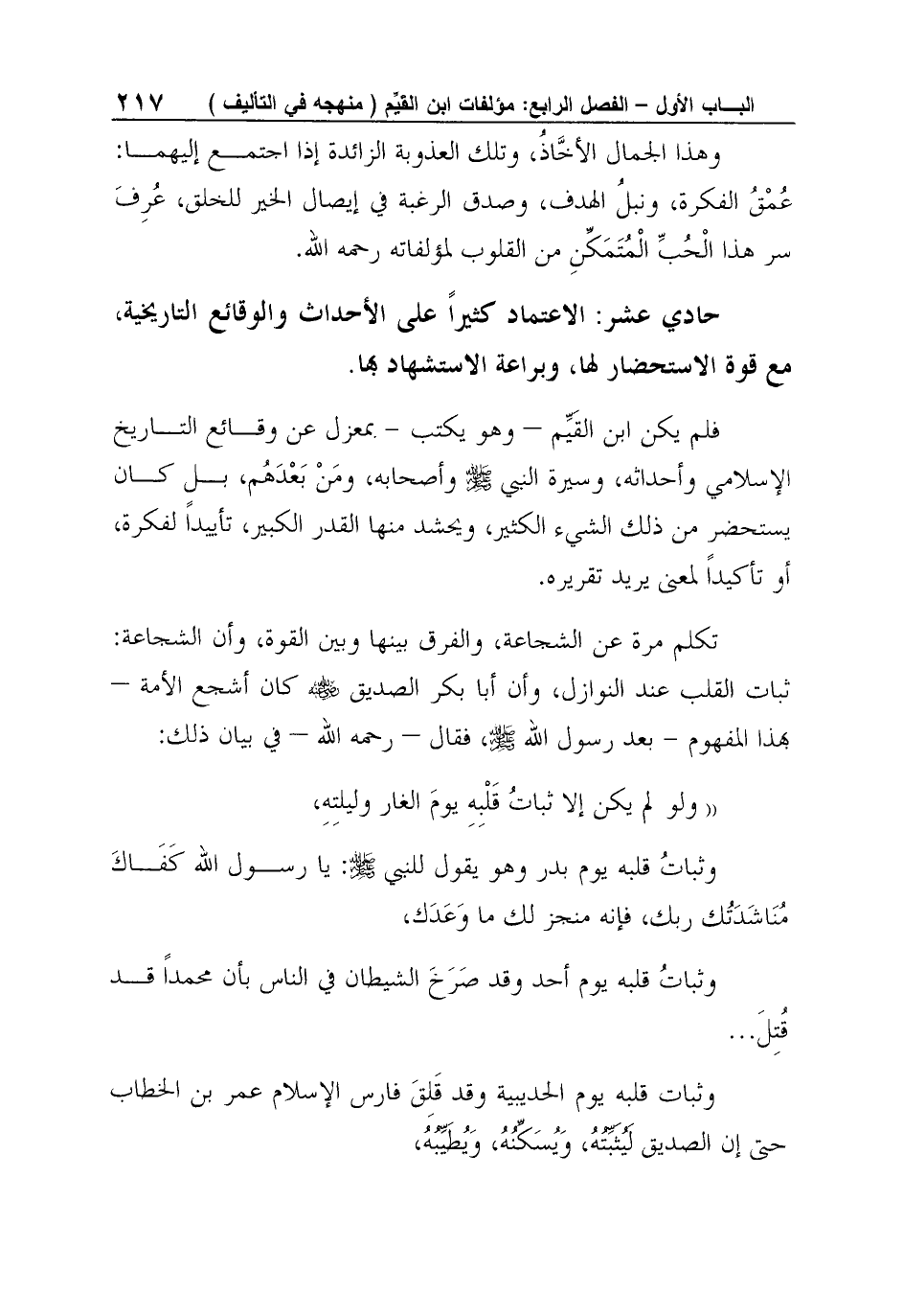 حادي عشر: الاعتماد كثيراً على الأحداث والوقائع التاريخية، مع قوة الاستحضار لها، وبراعة الاستشهاد بها.