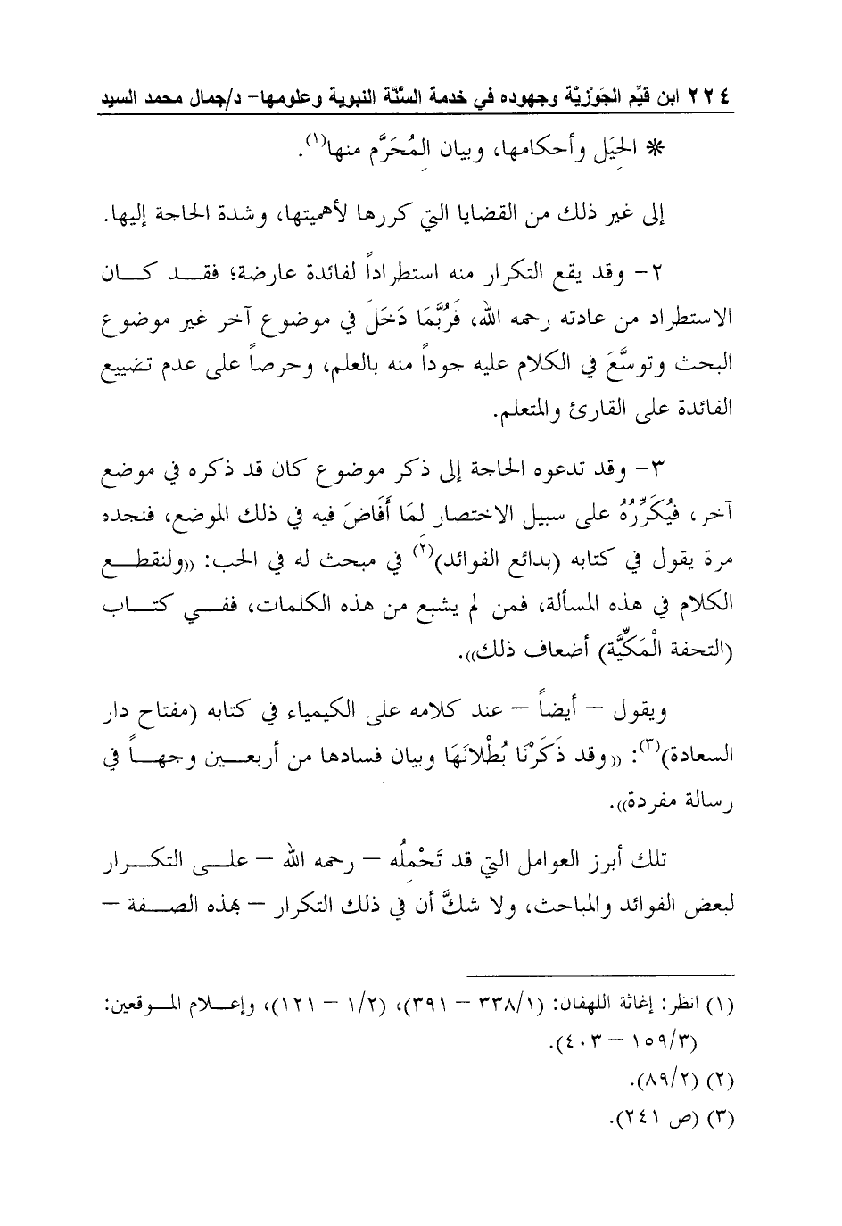 3- وقد تدعوه الحاجة إلى ذكر موضوع كان قد ذكره في موضع آخر، فيُكَرِّرُهُ على سبيل الاختصار لِمَا أَفَاضَ فيه في ذلك الموضع، فنجده مرة يقول في كتابه (بدائع الفوائد) 2 في مبحث له في الحب: "ولنقطع الكلام في هذه المسألة، فمن لم يشبع من هذه الكلمات، ففي كتاب (التحفة الْمَكِّيَّة) أضعاف ذلك".