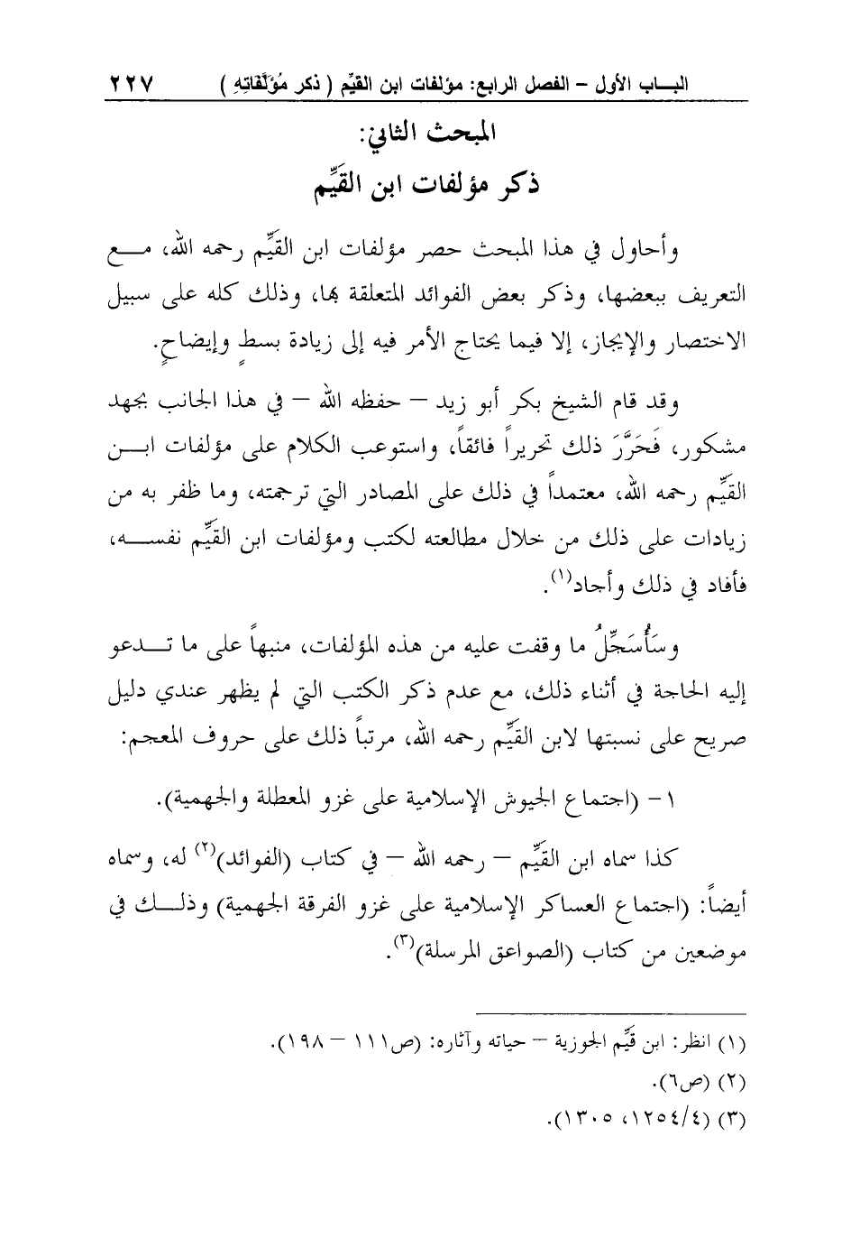 وقد قام الشيخ بكر أبو زيد - حفظه الله - في هذا الجانب بجهد مشكور، فَحَرَّرَ ذلك تحريراً فائقاً، واستوعب الكلام على مؤلفات ابن القَيِّم رحمه الله، معتمداً في ذلك على المصادر التي ترجمته، وما ظفر به من زيادات على ذلك من خلال مطالعته لكتب ومؤلفات ابن القَيِّم نفسه، فأفاد في ذلك وأجاد1.